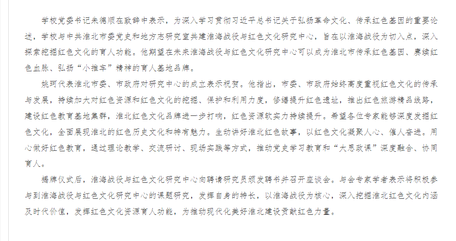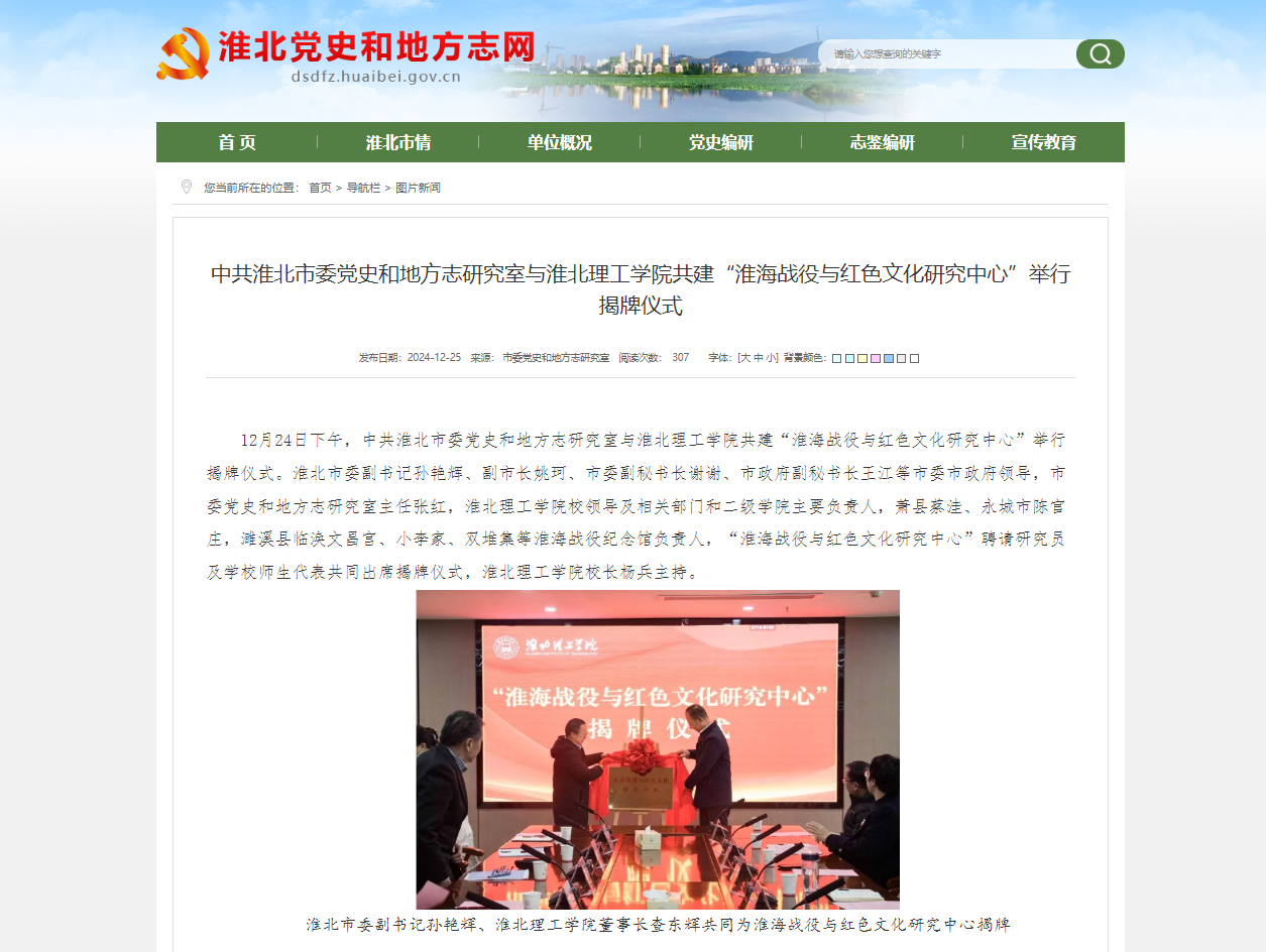 12月24日下午,中共淮北市委党史和地方志研究室与Beat365唯一官方网站共建“淮海战役与红色文化研究中心”举行揭牌仪式。淮北市委副书记孙艳辉、副市长姚珂、市委副秘书长谢谢、市政府副秘书长王江等市委市政府领导,市委党史和地方志研究室主任张红,Beat365唯一官方网站校领导及相关部门和二级学院主要负责人,萧县蔡洼、永城市陈官庄,濉溪县临涣文昌宫、小李家、双堆集等淮海战役纪念馆负责人,“淮海战役与红色文化研究中心”聘请研究员及学校师生代表共同出席揭牌仪式,Beat365唯一官方网站校长杨兵主持。对此,淮北党史和地方志网进行了报道: