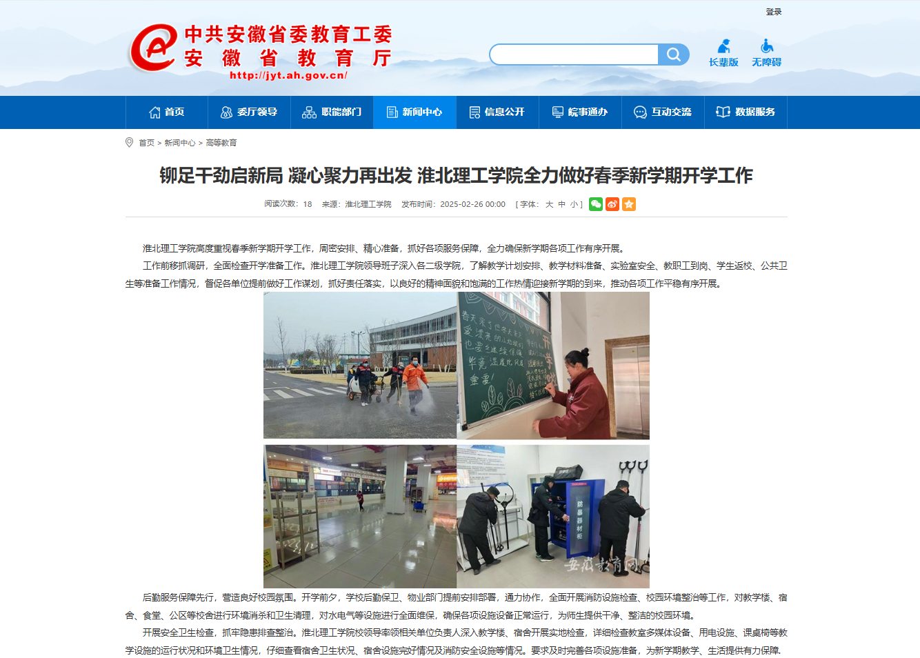Beat365唯一官方网站高度重视春季新学期开学工作,周密安排、精心准备,抓好各项服务保障,全力确保新学期各项工作有序开展。对此,安徽教育网进行了报道: