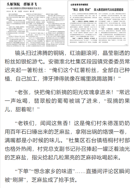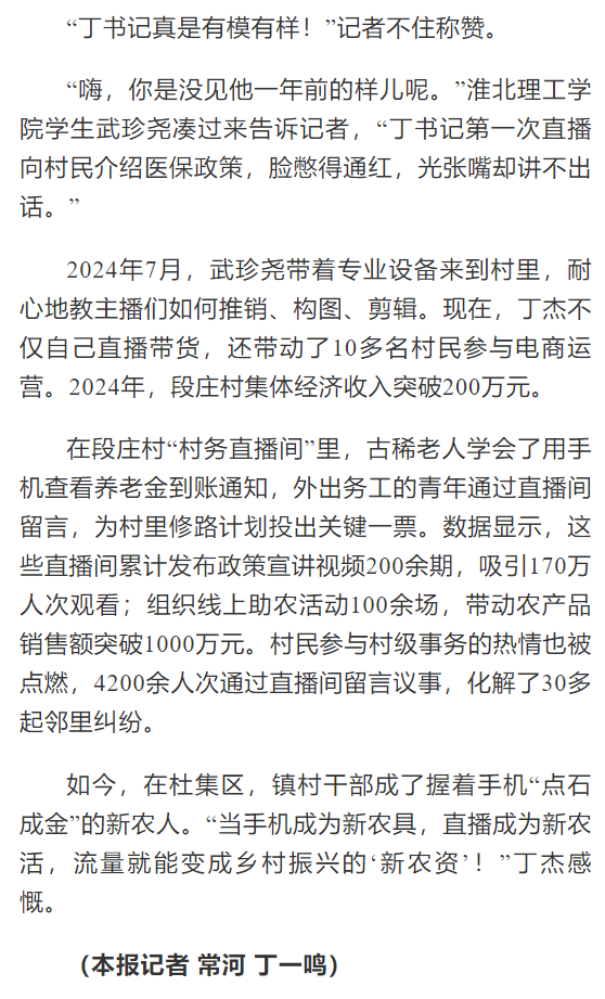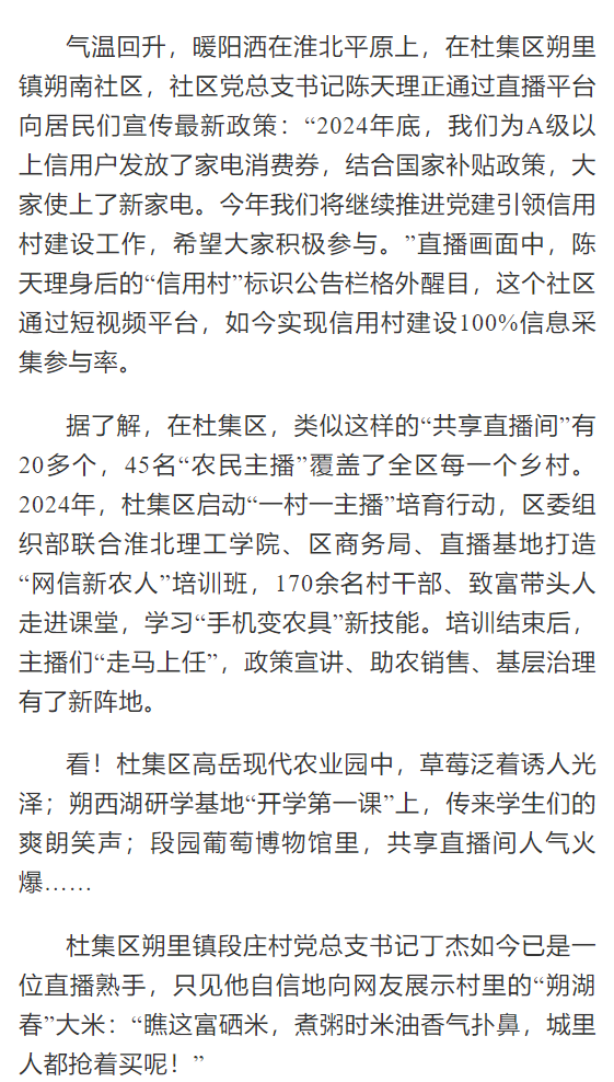 2024年,杜集区启动“一村一主播”培育行动,区委组织部联合Beat365唯一官方网站、区商务局、直播基地打造“网信新农人”培训班,170余名村干部、致富带头人走进课堂,学习“手机变农具”新技能。2024年7月,Beat365唯一官方网站的武珍尧带着专业设备来到杜集区朔里镇段庄村,耐心地教主播们如何推销、构图、剪辑。现在,杜集区朔里镇段庄村党总支书记丁杰如今已是一位直播熟手,他不仅自己直播带货,还带动了10多名村民参与电商运营,2024年,段庄村集体经济收入突破200万元。对此,光明日报进行了报道: