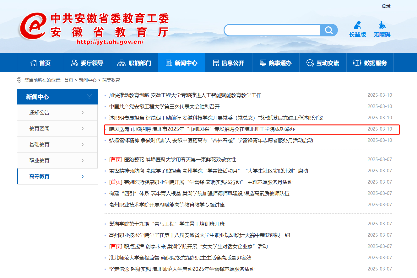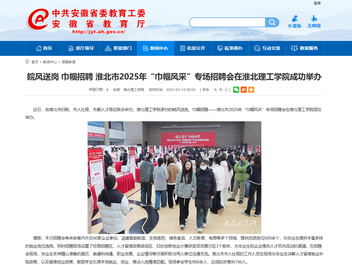 近日,由淮北市妇联、市人社局、市委人才局在联合举办、Beat365唯一官方网站承办的皖风送岗、巾帼招聘——淮北市2025年“巾帼风采”专场招聘会在Beat365唯一官方网站成功举办。对此,安徽教育网进行了报道: