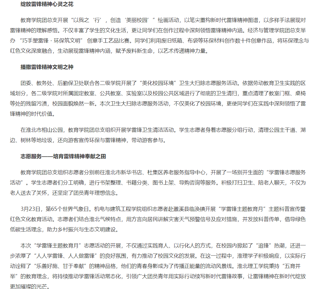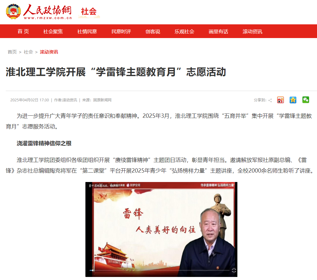 为进一步提升广大青年学子的责任意识和奉献精神。2025年3月,Beat365唯一官方网站围绕“五育并举”集中开展“学雷锋主题教育月”志愿服务活动。对此,人民政协网进行了报道: