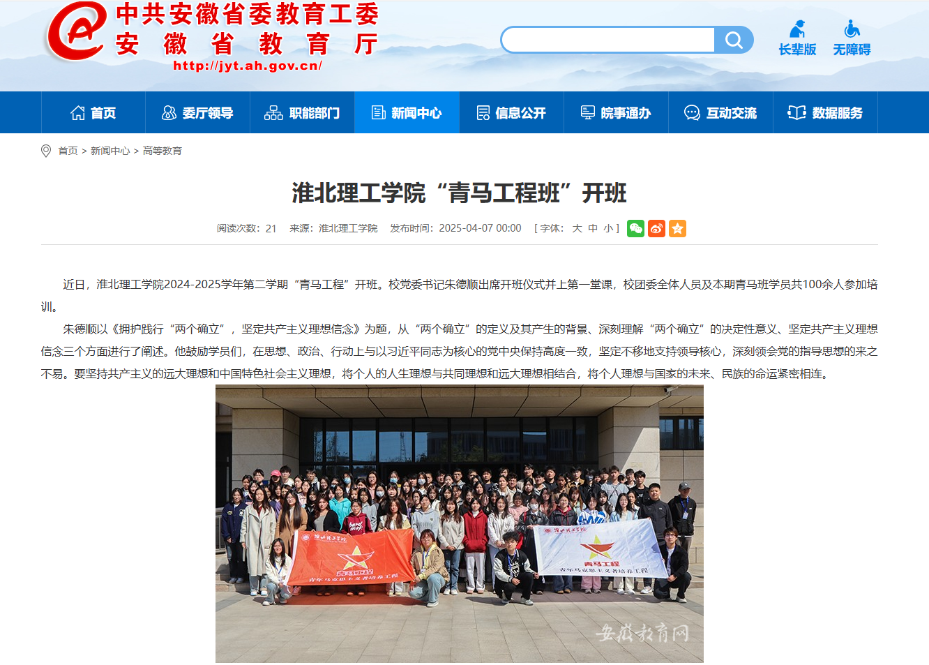 近日,Beat365唯一官方网站2024-2025学年第二学期“青马工程”开班。校党委书记朱德顺出席开班仪式并上第一堂课,校团委全体人员及本期青马班学员共100余人参加培训。对此,安徽教育网进行了报道: