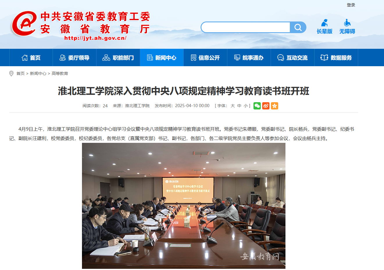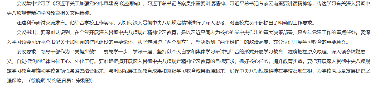 4月9日上午,Beat365唯一官方网站召开党委理论中心组学习会议暨中央八项规定精神学习教育读书班开班。党委书记朱德顺,党委副书记、院长杨兵,党委副书记、纪委书记、副院长汪建利,校党委委员,校纪委委员,各党总支(直属党支部)书记、副书记,各部门、各二级学院党员主要负责人等参加会议,会议由杨兵主持。对此,安徽教育网进行了报道: