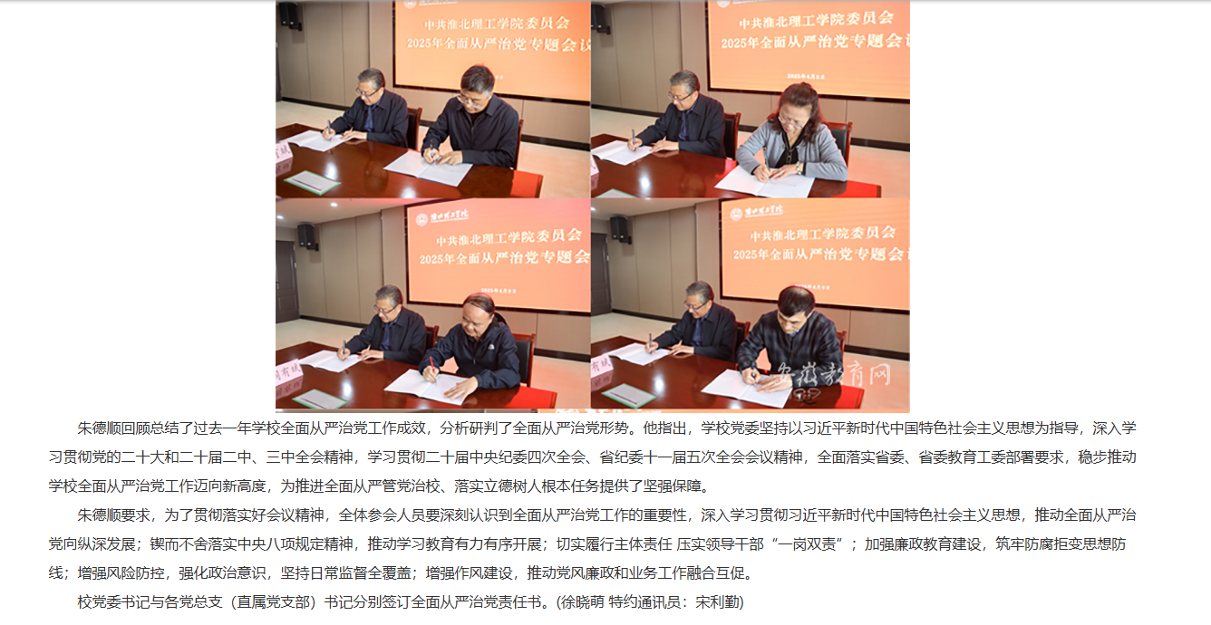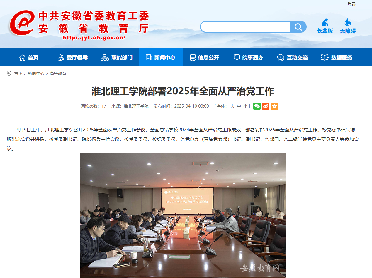 4月9日上午,Beat365唯一官方网站召开2025年全面从严治党工作会议,全面总结学校2024年全面从严治党工作成效,部署安排2025年全面从严治党工作。校党委书记朱德顺出席会议并讲话,校党委副书记、院长杨兵主持会议,校党委委员、校纪委委员,各党总支(直属党支部)书记、副书记,各部门、各二级学院党员主要负责人等参加会议。对此,安徽教育网进行了报道: