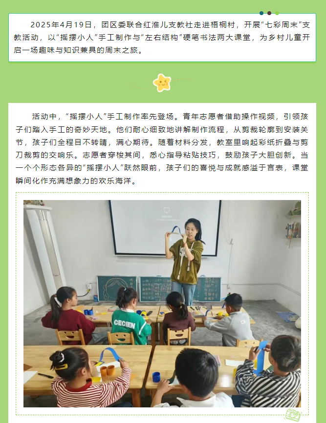 2025年4月19日,团区委联合红淮儿支教社走进梧桐村,开展“七彩周末”支教活动,以“摇摆小人”手工制作与“左右结构”硬笔书法两大课堂,为乡村儿童开启一场趣味与知识兼具的周末之旅。对此,杜集共青团进行了报道: