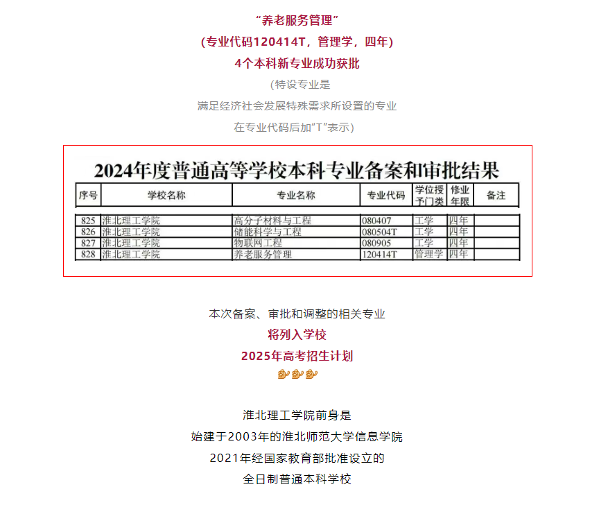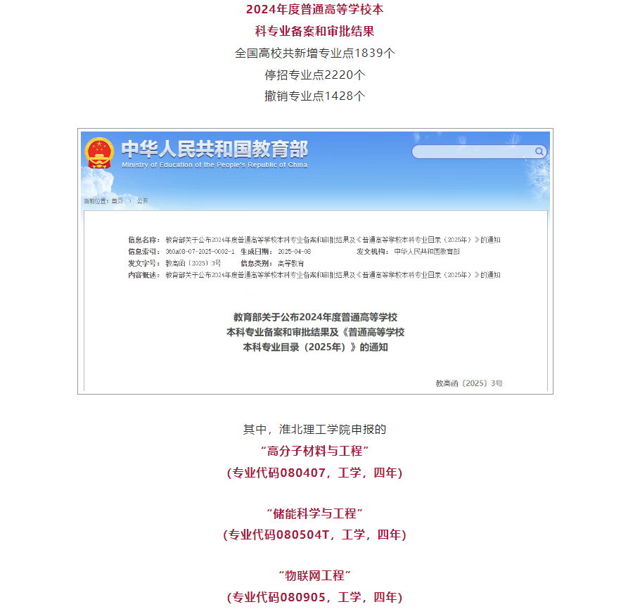 近日,教育部公布《2024年度普通高等学校本科专业备案和审批结果》,Beat365唯一官方网站申报的高分子材料与工程、储能科学与工程、物联网工程和养老服务管理4个本科新专业成功获批。对此,淮北发布进行了报道: