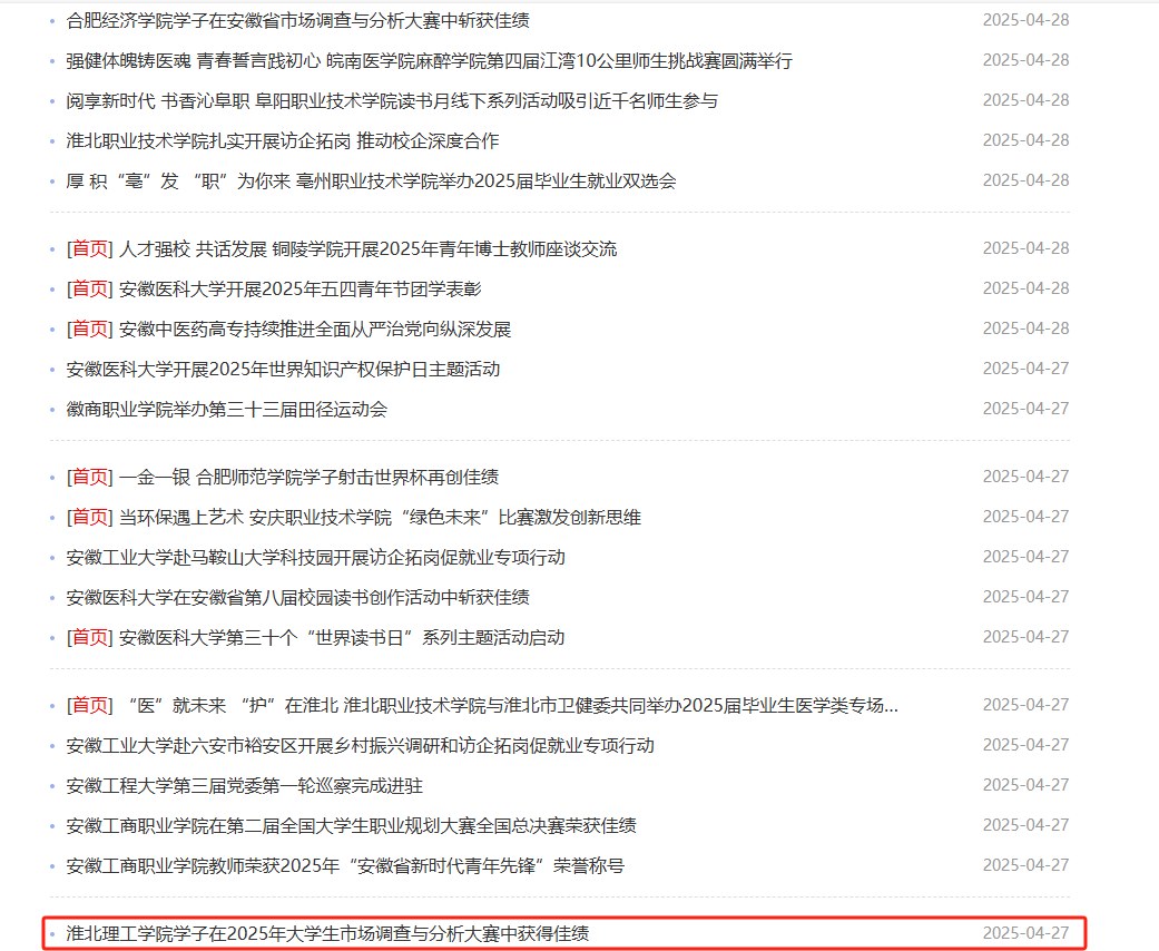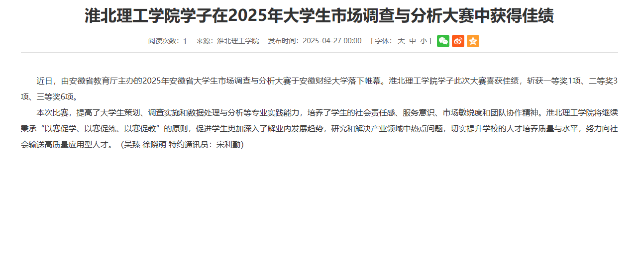 近日,由安徽省教育厅主办的2025年安徽省大学生市场调查与分析大赛于安徽财经大学落下帷幕。Beat365唯一官方网站学子此次大赛喜获佳绩,斩获一等奖1项、二等奖3项、三等奖6项。对此,安徽教育网进行了报道: