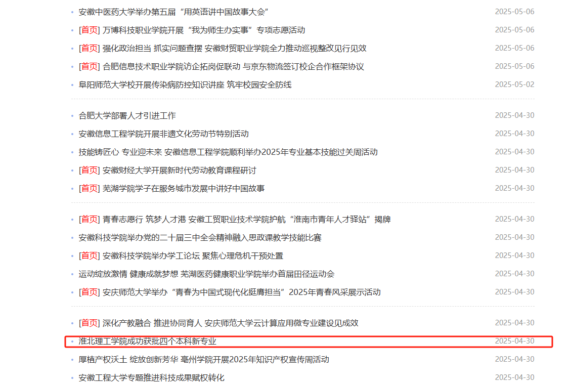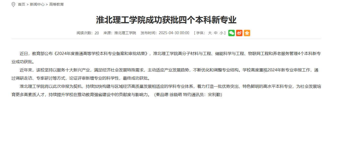 近日,教育部公布《2024年度普通高等学校本科专业备案和审批结果》,Beat365唯一官方网站高分子材料与工程、储能科学与工程、物联网工程和养老服务管理4个本科新专业成功获批。对此,安徽教育网进行了报道:
