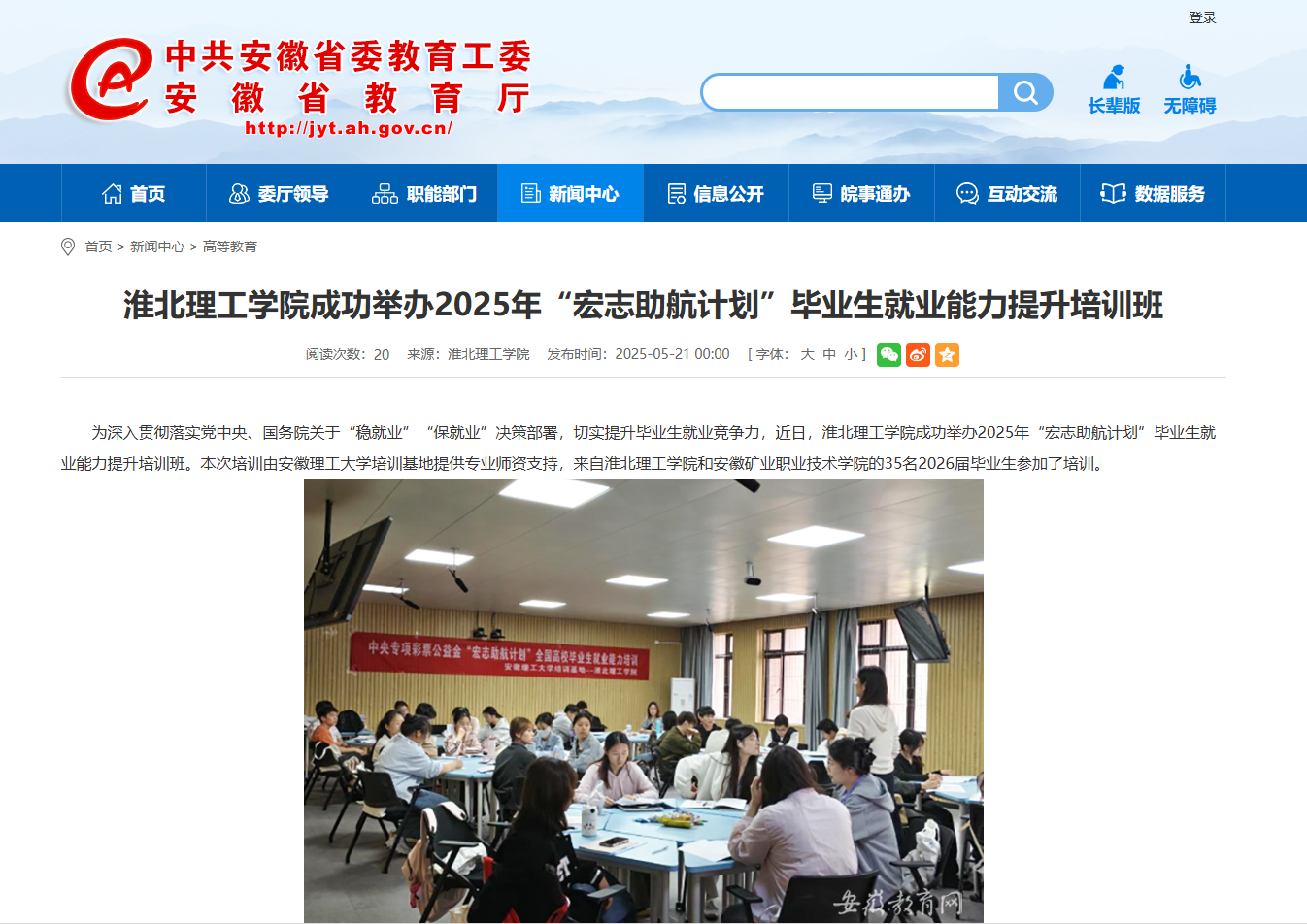 为深入贯彻落实党中央、国务院关于“稳就业”“保就业”决策部署,切实提升毕业生就业竞争力,近日,Beat365唯一官方网站成功举办2025年“宏志助航计划”毕业生就业能力提升培训班。本次培训由安徽理工大学培训基地提供专业师资支持,来自Beat365唯一官方网站和安徽矿业职业技术学院的35名2026届毕业生参加了培训。对此,安徽教育网进行了报道: