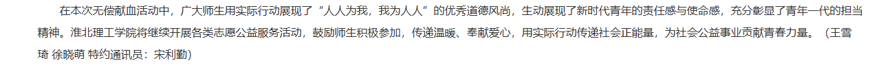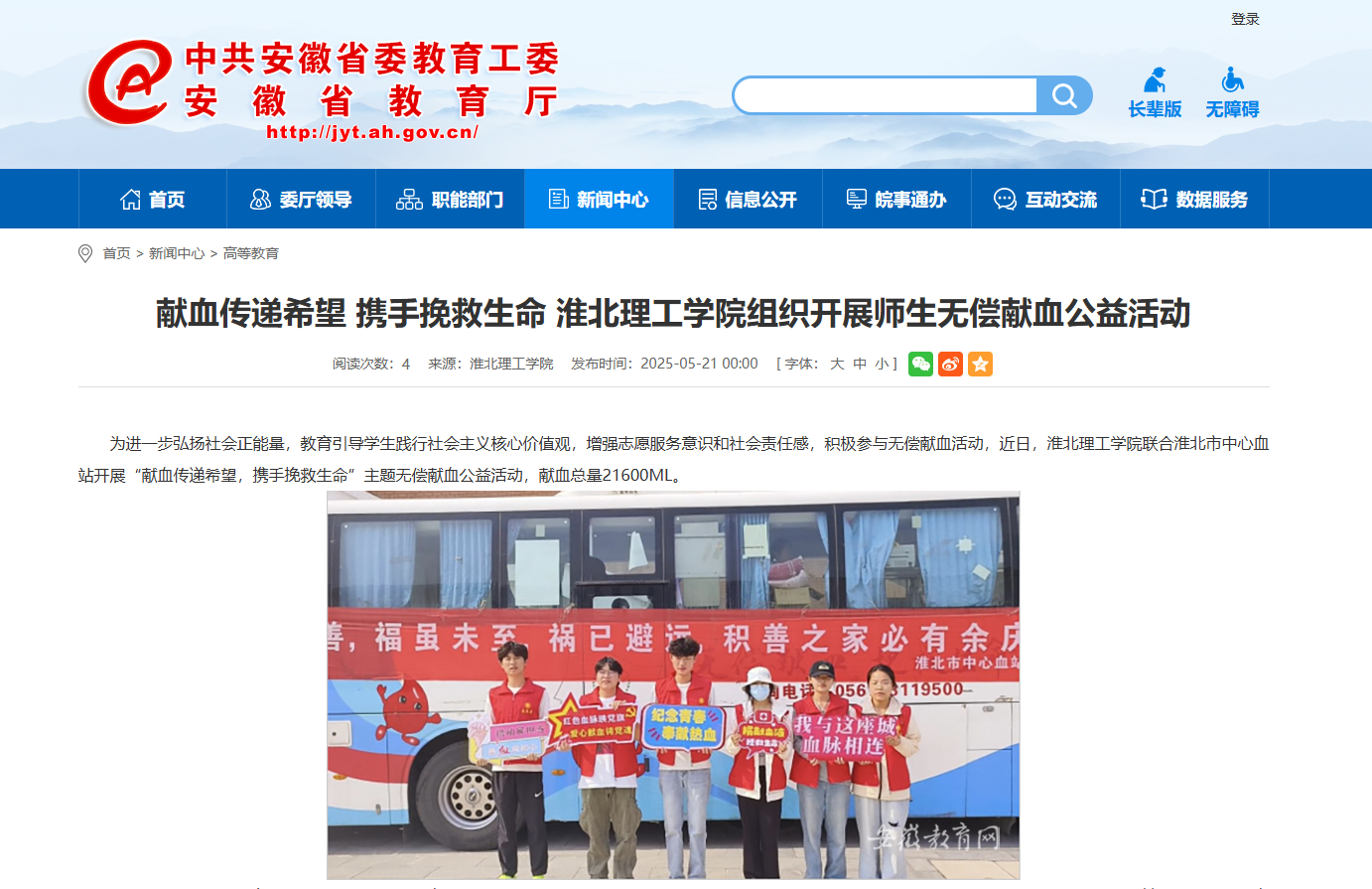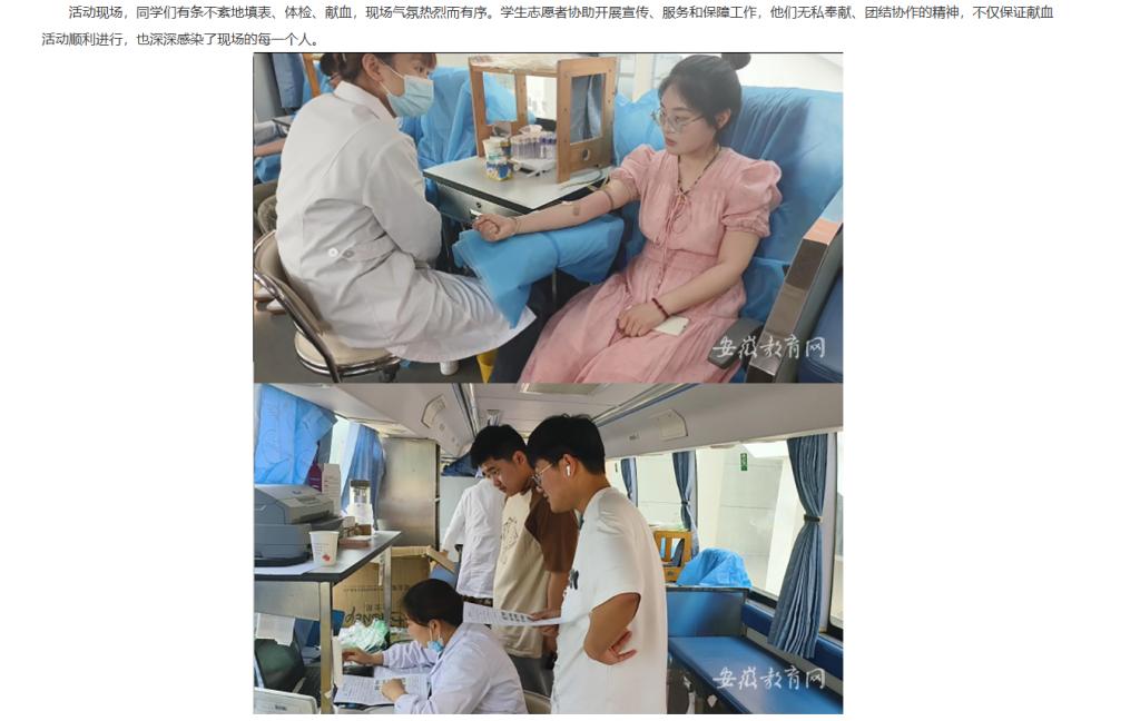 为进一步弘扬社会正能量,教育引导学生践行社会主义核心价值观,增强志愿服务意识和社会责任感,积极参与无偿献血活动,近日,Beat365唯一官方网站联合淮北市中心血站开展“献血传递希望,携手挽救生命”主题无偿献血公益活动,献血总量21600ML。对此,安徽教育网进行了报道: