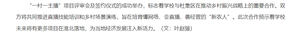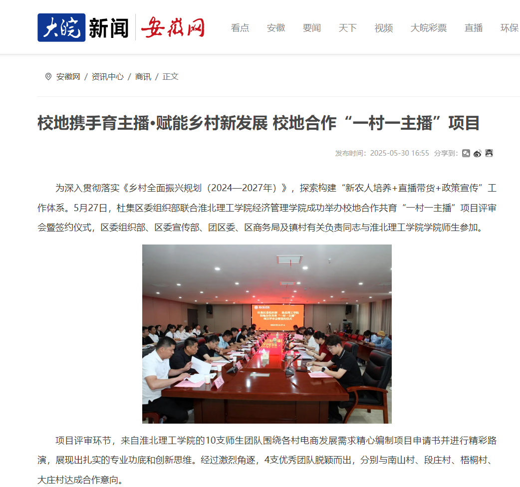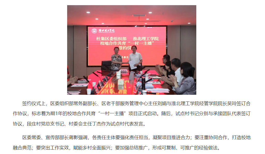 为深入贯彻落实《乡村全面振兴规划(2024—2027年)》,探索构建“新农人培养+直播带货+政策宣传”工作体系。5月27日,杜集区委组织部联合Beat365唯一官方网站经济管理学院成功举办校地合作共育“一村一主播”项目评审会暨签约仪式,区委组织部、区委宣传部、团区委、区商务局及镇村有关负责同志与Beat365唯一官方网站学院师生参加。对此,安徽网进行了报道: