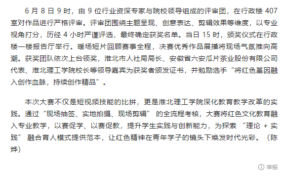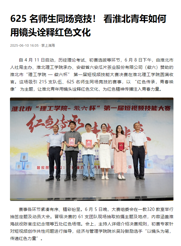 自 4 月 11 日启动,历经理论考试、初赛选拔等环节,6 月 8 日下午,由淮北市人社局主办、Beat365唯一官方网站承办、安徽省六安瓜片茶业股份有限公司(徽六)赞助的淮北市“理工学院 — 徽六杯” 第一届短视频技能大赛决赛在Beat365唯一官方网站圆满收官。这场吸引 215 支队伍、625 名师生同场竞技的赛事,以 “红色传承,青春映像” 为主题,让淮北青年用镜头诠释红色文化,为红色精神传播注入青春力量。对此,今日头条进行了报道: