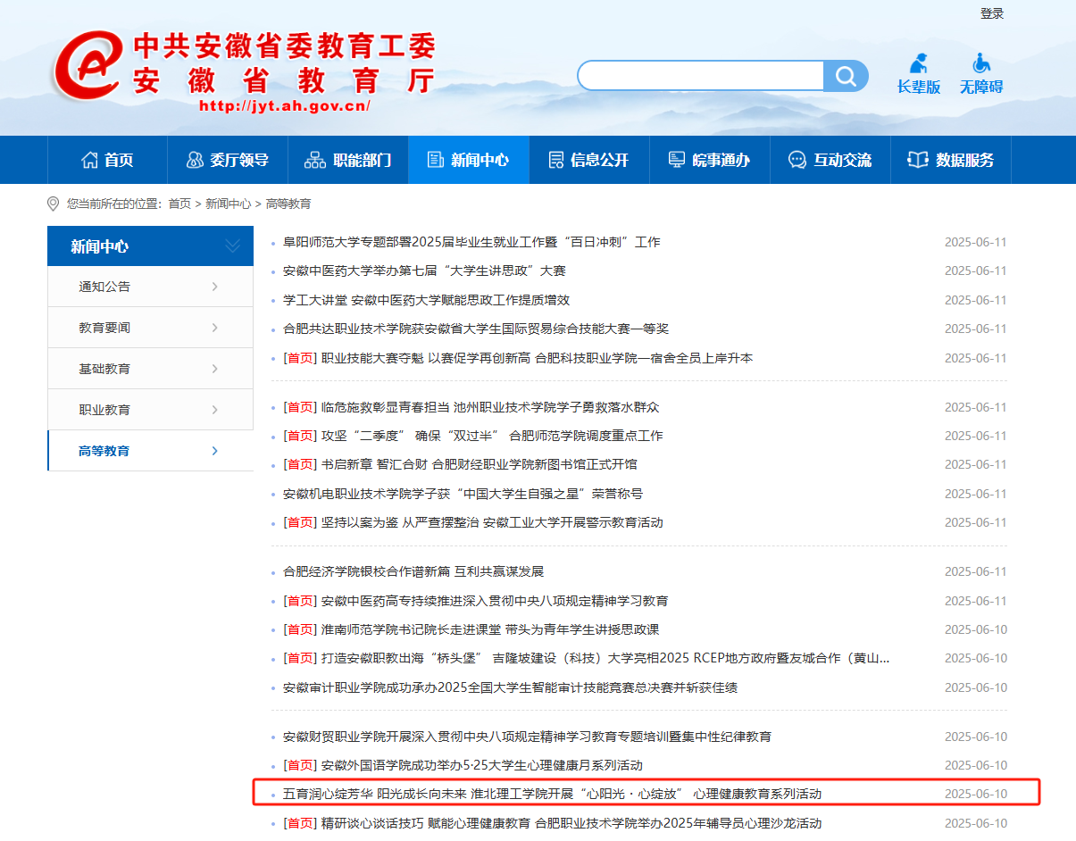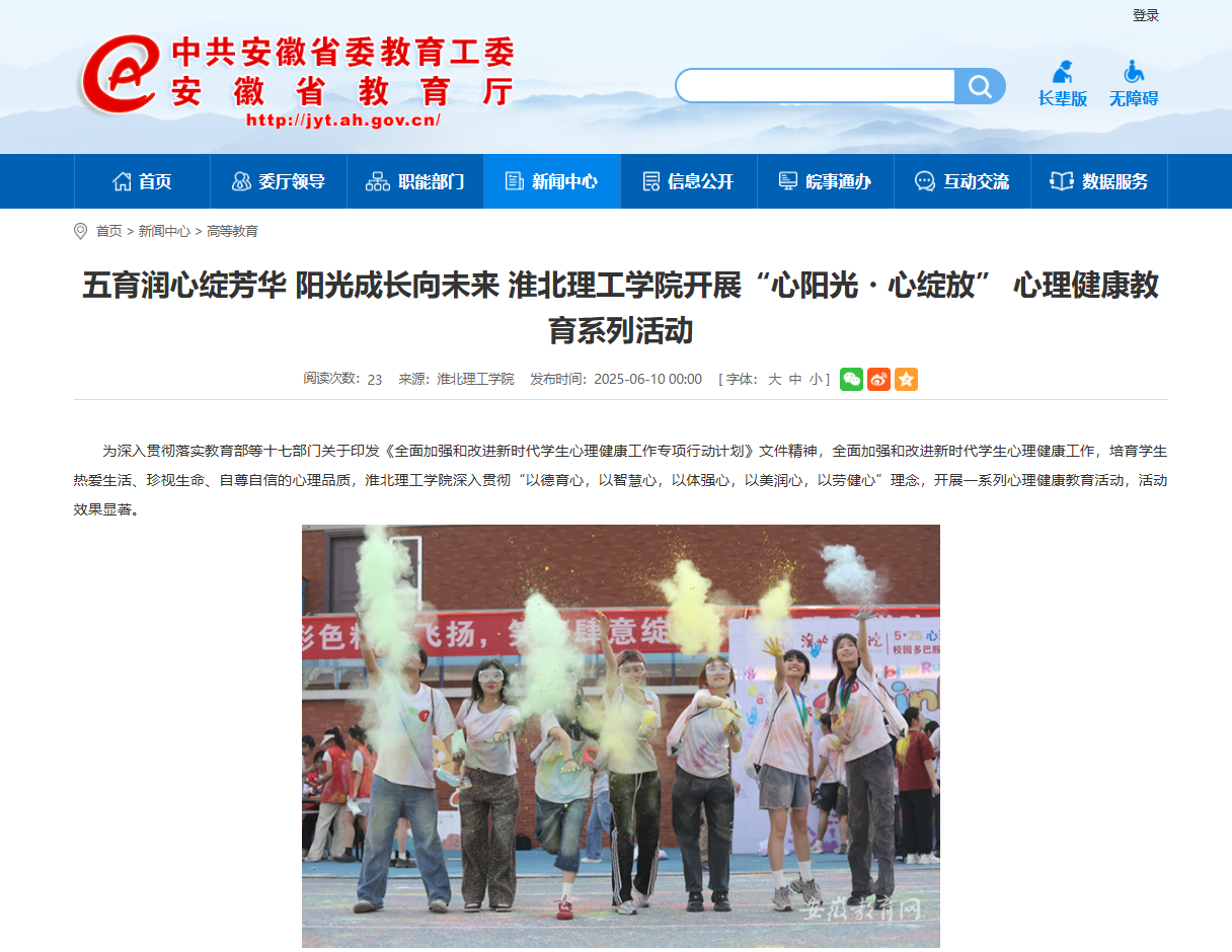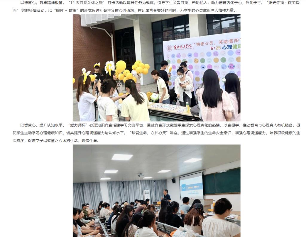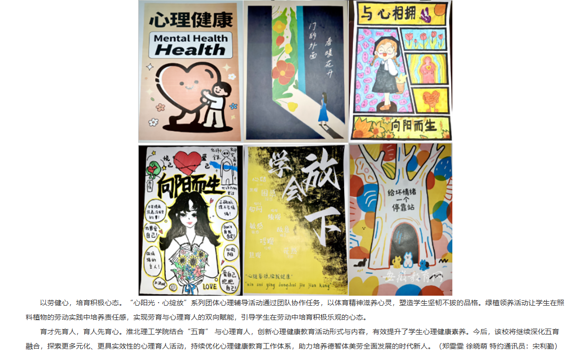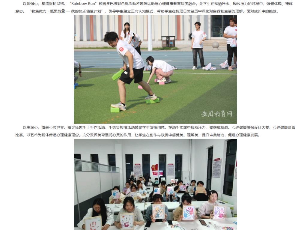 为深入贯彻落实教育部等十七部门关于印发《全面加强和改进新时代学生心理健康工作专项行动计划》文件精神,全面加强和改进新时代学生心理健康工作,培育学生热爱生活、珍视生命、自尊自信的心理品质,Beat365唯一官方网站深入贯彻“以德育心,以智慧心,以体强心,以美润心,以劳健心”理念,开展一系列心理健康教育活动,活动效果显著。对此,安徽教育网进行了报道: