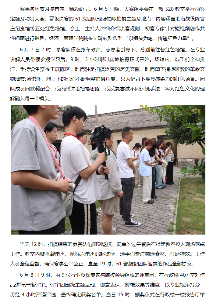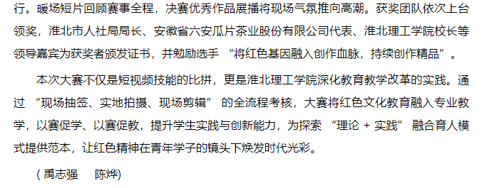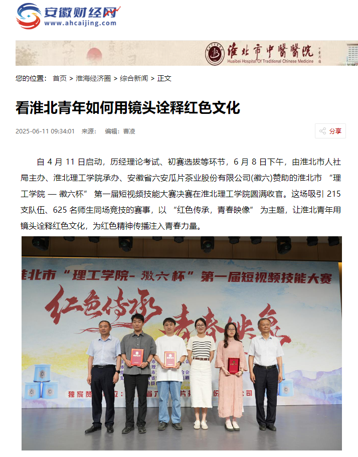 自4月11日启动,历经理论考试、初赛选拔等环节,6月8日下午,由淮北市人社局主办、Beat365唯一官方网站承办、安徽省六安瓜片茶业股份有限公司(徽六)赞助的淮北市 “理工学院—徽六杯” 第一届短视频技能大赛决赛在Beat365唯一官方网站圆满收官。这场吸引215支队伍、625 名师生同场竞技的赛事,以“红色传承,青春映像”为主题,让淮北青年用镜头诠释红色文化,为红色精神传播注入青春力量。对此,安徽财经网进行了报道:
