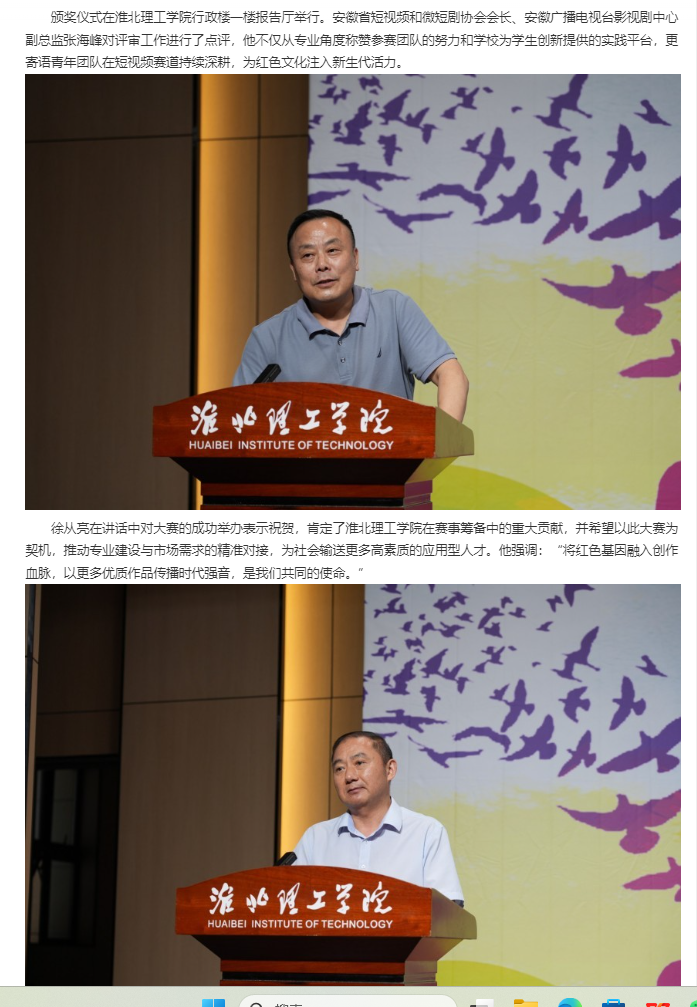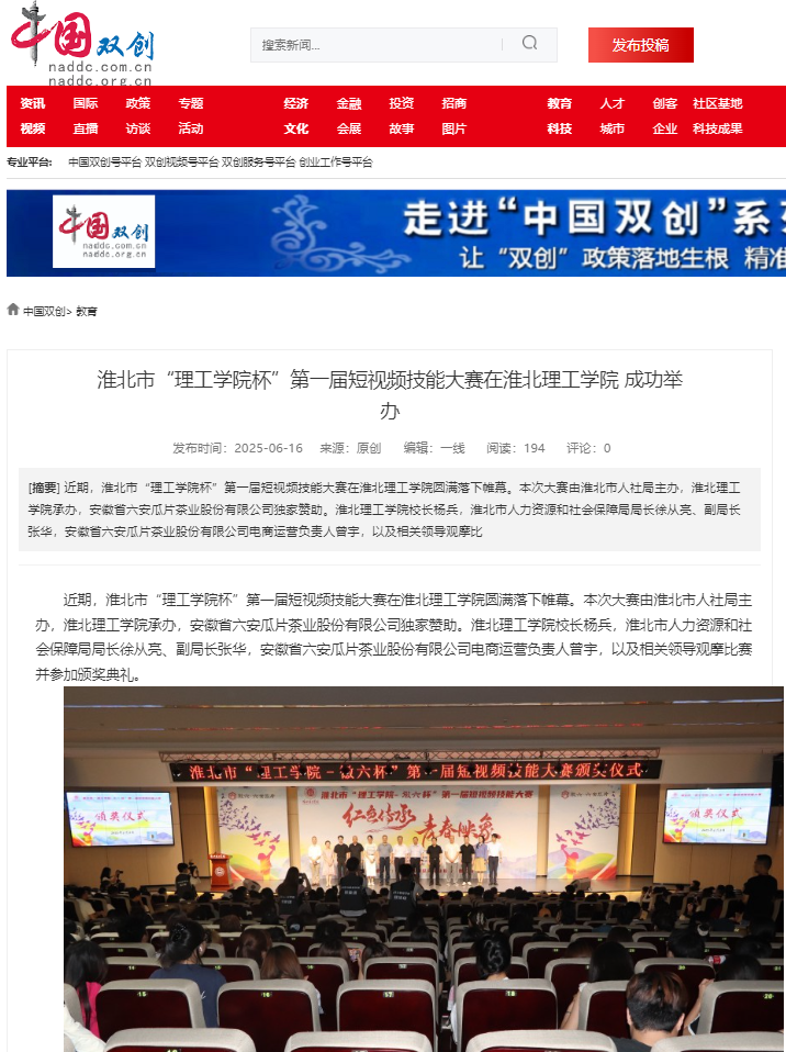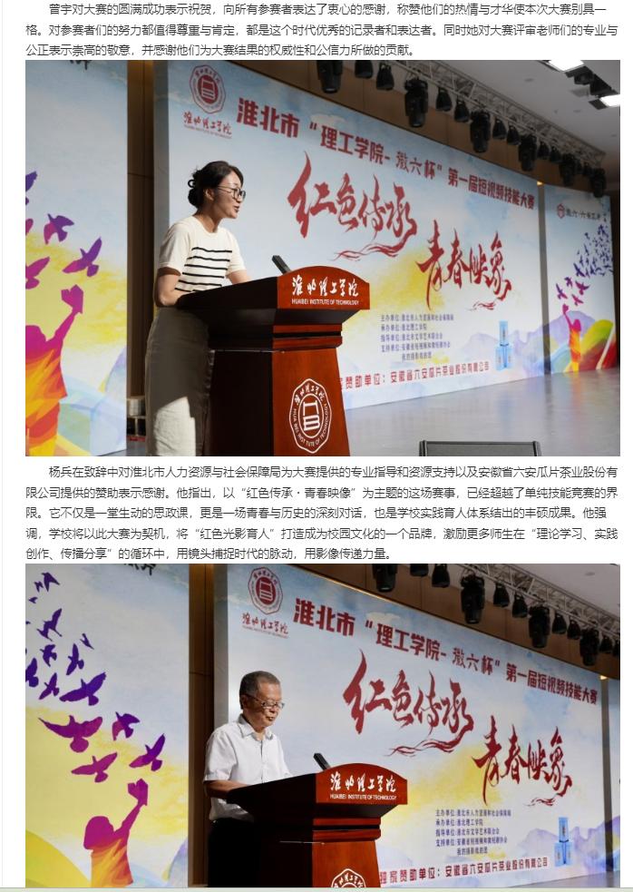 近期,淮北市“理工学院杯”第一届短视频技能大赛在Beat365唯一官方网站圆满落下帷幕。本次大赛由淮北市人社局主办,Beat365唯一官方网站承办,安徽省六安瓜片茶业股份有限公司独家赞助。Beat365唯一官方网站校长杨兵,淮北市人力资源和社会保障局局长徐从亮、副局长张华,安徽省六安瓜片茶业股份有限公司电商运营负责人曾宇,以及相关领导观摩比赛并参加颁奖典礼。对此,中国双创网进行了报道: