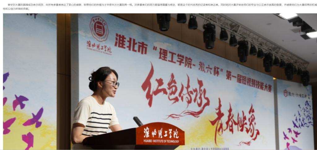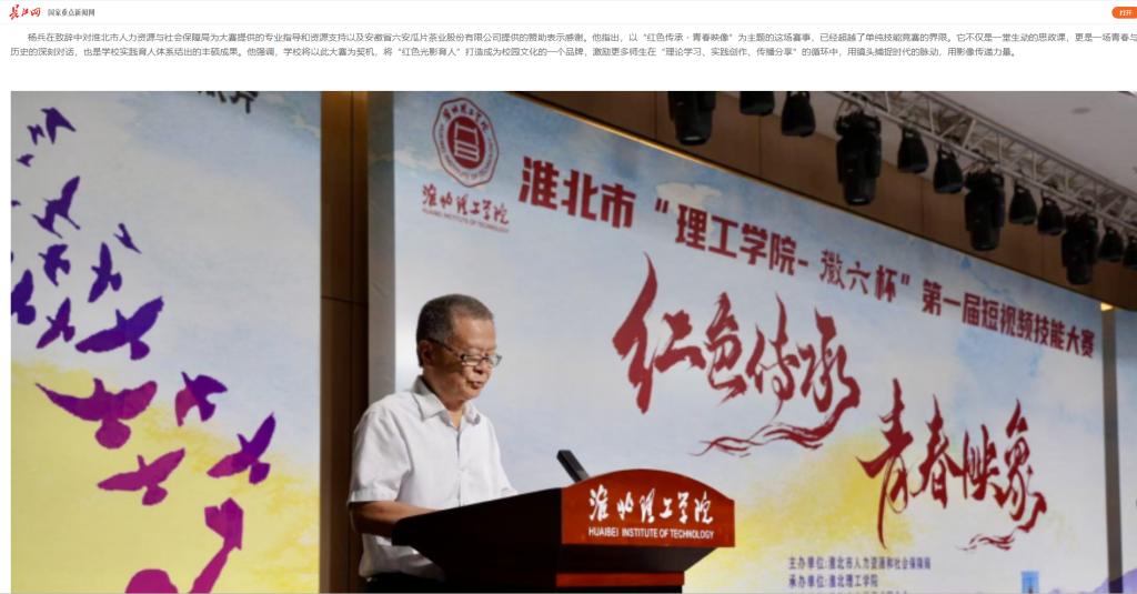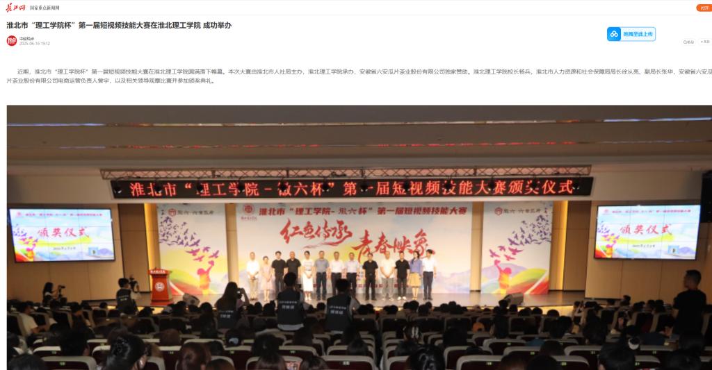 近期,淮北市“理工学院杯”第一届短视频技能大赛在Beat365唯一官方网站圆满落下帷幕。本次大赛由淮北市人社局主办,Beat365唯一官方网站承办,安徽省六安瓜片茶业股份有限公司独家赞助。Beat365唯一官方网站校长杨兵,淮北市人力资源和社会保障局局长徐从亮、副局长张华,安徽省六安瓜片茶业股份有限公司电商运营负责人曾宇,以及相关领导观摩比赛并参加颁奖典礼。对此,长江网进行了报道: