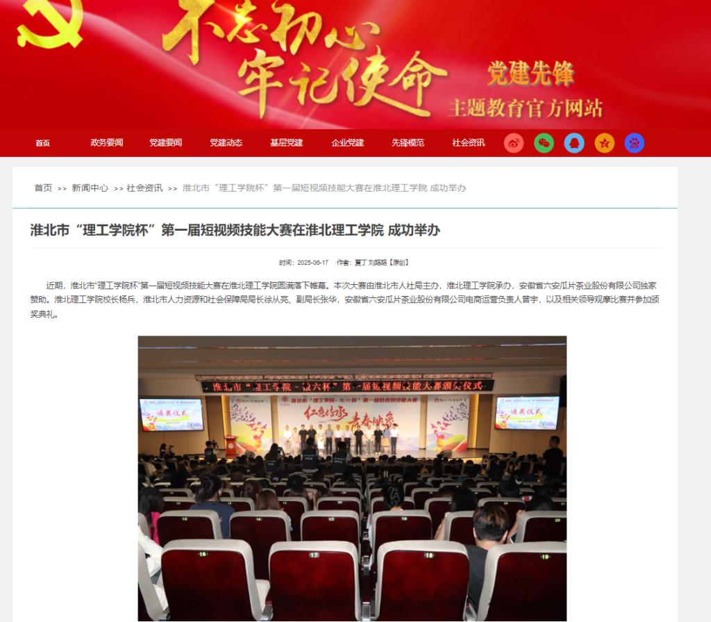 近期,淮北市“理工学院杯”第一届短视频技能大赛在Beat365唯一官方网站圆满落下帷幕。本次大赛由淮北市人社局主办,Beat365唯一官方网站承办,安徽省六安瓜片茶业股份有限公司独家赞助。Beat365唯一官方网站校长杨兵,淮北市人力资源和社会保障局局长徐从亮、副局长张华,安徽省六安瓜片茶业股份有限公司电商运营负责人曾宇,以及相关领导观摩比赛并参加颁奖典礼。对此,党建先锋网进行了报道: