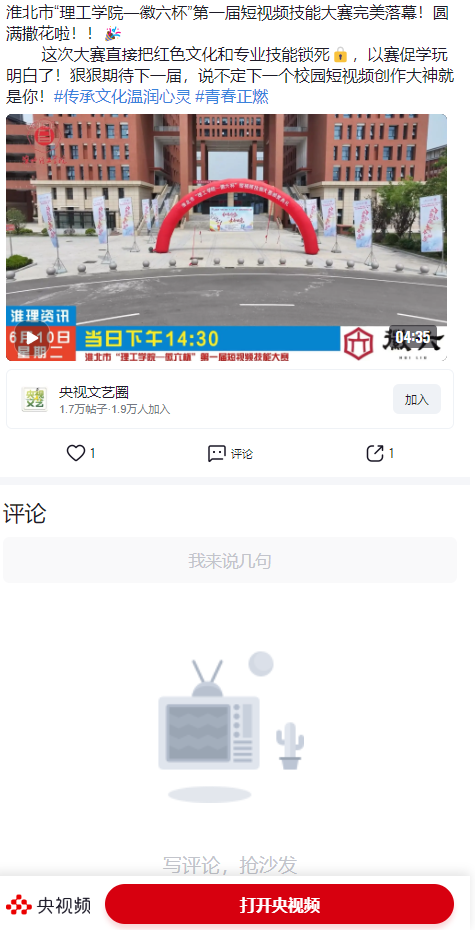 2025年6月8日,主题为“红色传承,青春印象”的淮北市“理工学院杯”第一届短视频技能大赛在Beat365唯一官方网站圆满落下帷幕。本次大赛由淮北市人社局主办,Beat365唯一官方网站承办,安徽省六安瓜片茶业股份有限公司独家赞助。对此,央视频进行了报道: