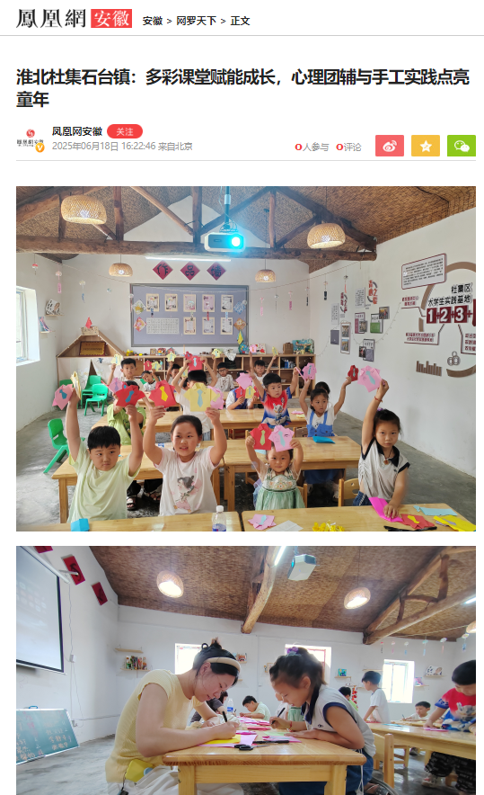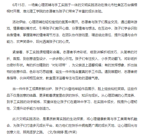 6月15日,一场集心理团辅与手工实践于一体的文明实践活动在淮北市杜集区石台镇梧桐村开展,Beat365唯一官方网站的志愿者为孩子们带来了丰富的成长体验。对此,凤凰网安徽进行了报道: