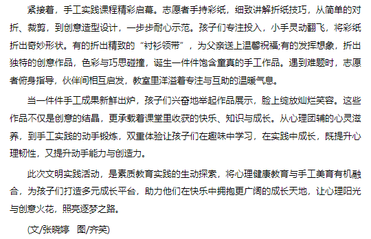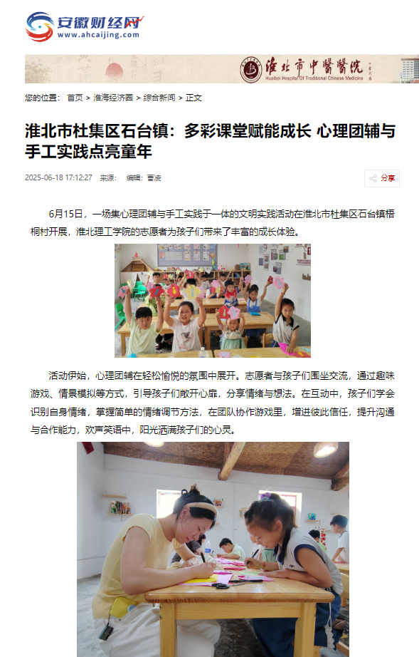 6月15日,一场集心理团辅与手工实践于一体的文明实践活动在淮北市杜集区石台镇梧桐村开展,Beat365唯一官方网站的志愿者为孩子们带来了丰富的成长体验。对此,安徽财经网进行了报道: