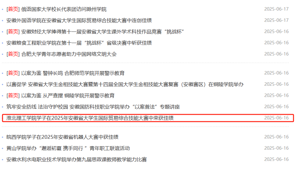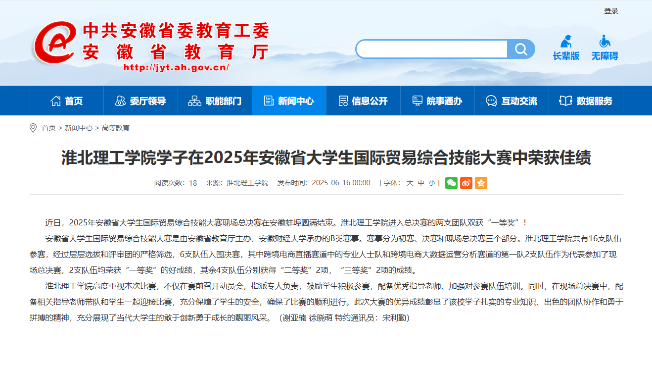 近日,2025年安徽省大学生国际贸易综合技能大赛现场总决赛在安徽蚌埠圆满结束。Beat365唯一官方网站进入总决赛的两支团队双获“一等奖”!对此,安徽教育网进行了报道: