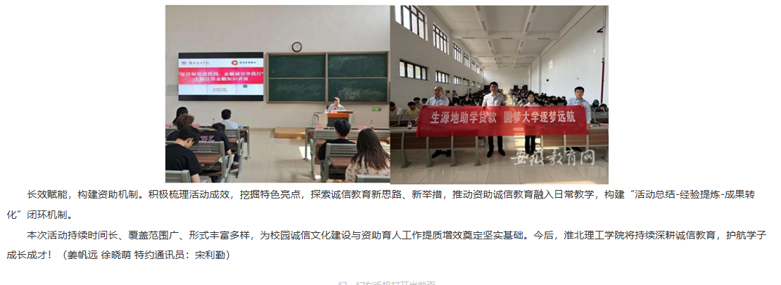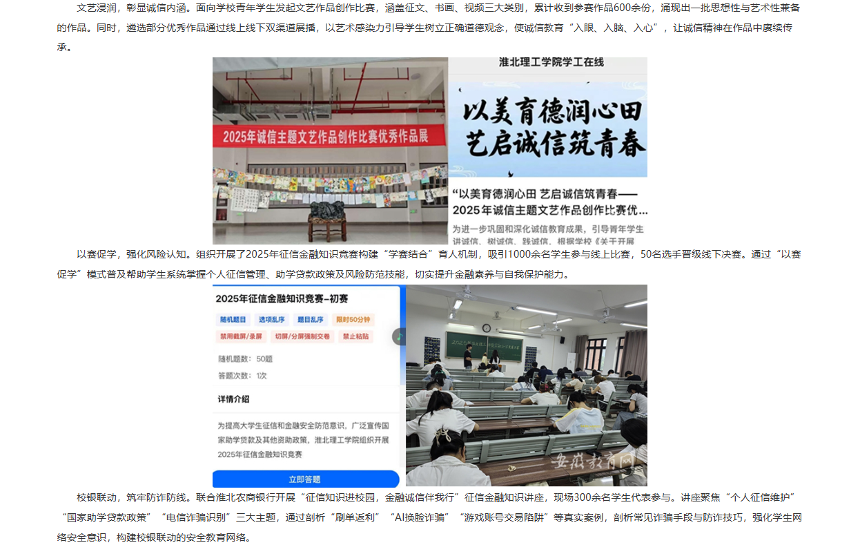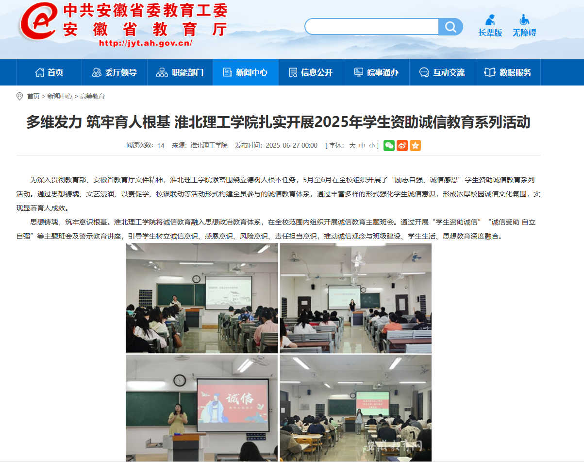为深入贯彻教育部、安徽省教育厅文件精神,Beat365唯一官方网站紧密围绕立德树人根本任务,5月至6月在全校组织开展了“励志自强、诚信感恩”学生资助诚信教育系列活动。通过思想铸魂、文艺浸润、以赛促学、校银联动等活动形式构建全员参与的诚信教育体系,通过丰富多样的形式强化学生诚信意识,形成浓厚校园诚信文化氛围,实现显著育人成效。对此,安徽教育网进行了报道:
