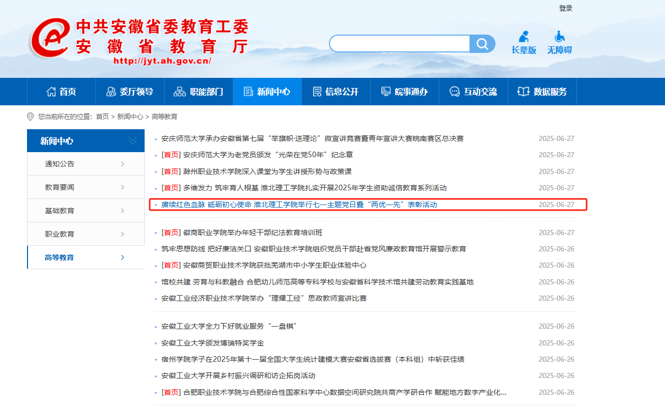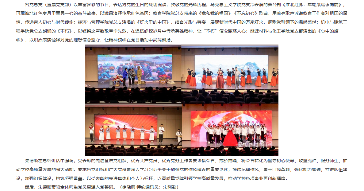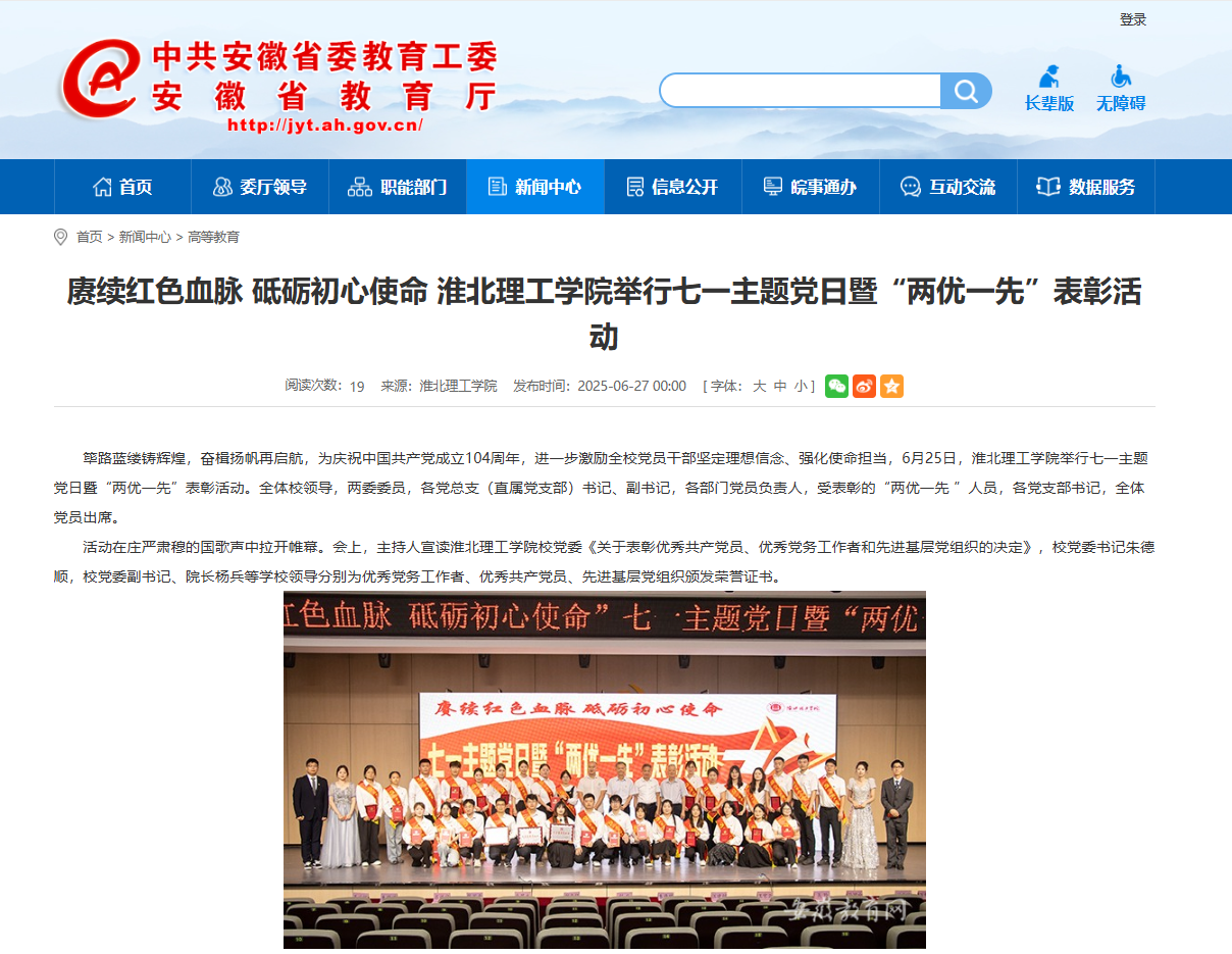 筚路蓝缕铸辉煌,奋楫扬帆再启航,为庆祝中国共产党成立104周年,进一步激励全校党员干部坚定理想信念、强化使命担当,6月25日,Beat365唯一官方网站举行七一主题党日暨“两优一先”表彰活动。全体校领导,两委委员,各党总支(直属党支部)书记、副书记,各部门党员负责人,受表彰的“两优一先 ”人员,各党支部书记,全体党员出席。对此,安徽教育网进行了报道: