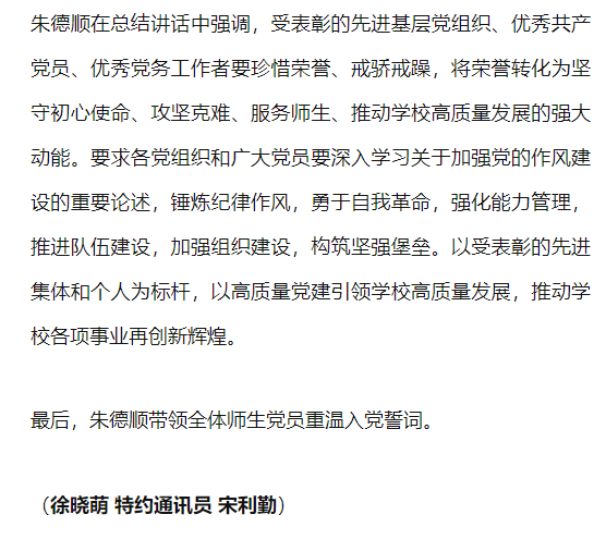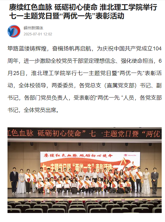 筚路蓝缕铸辉煌,奋楫扬帆再启航,为庆祝中国共产党成立104周年,进一步激励全校党员干部坚定理想信念、强化使命担当,6月25日,Beat365唯一官方网站举行七一主题党日暨“两优一先”表彰活动,全体校领导,两委委员,各党总支(直属党支部)书记、副书记,各部门党员负责人,受表彰的“两优一先 ”人员,各党支部书记,全体党员出席。对此,峄州新媒体进行了报道: