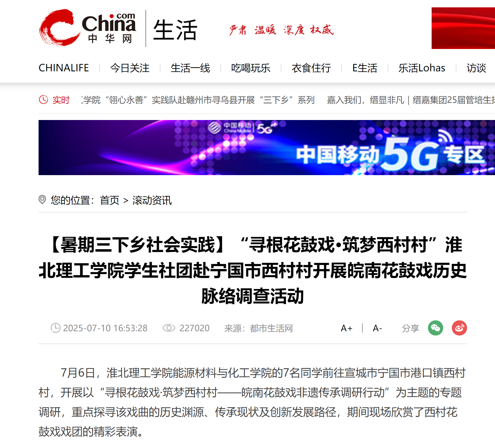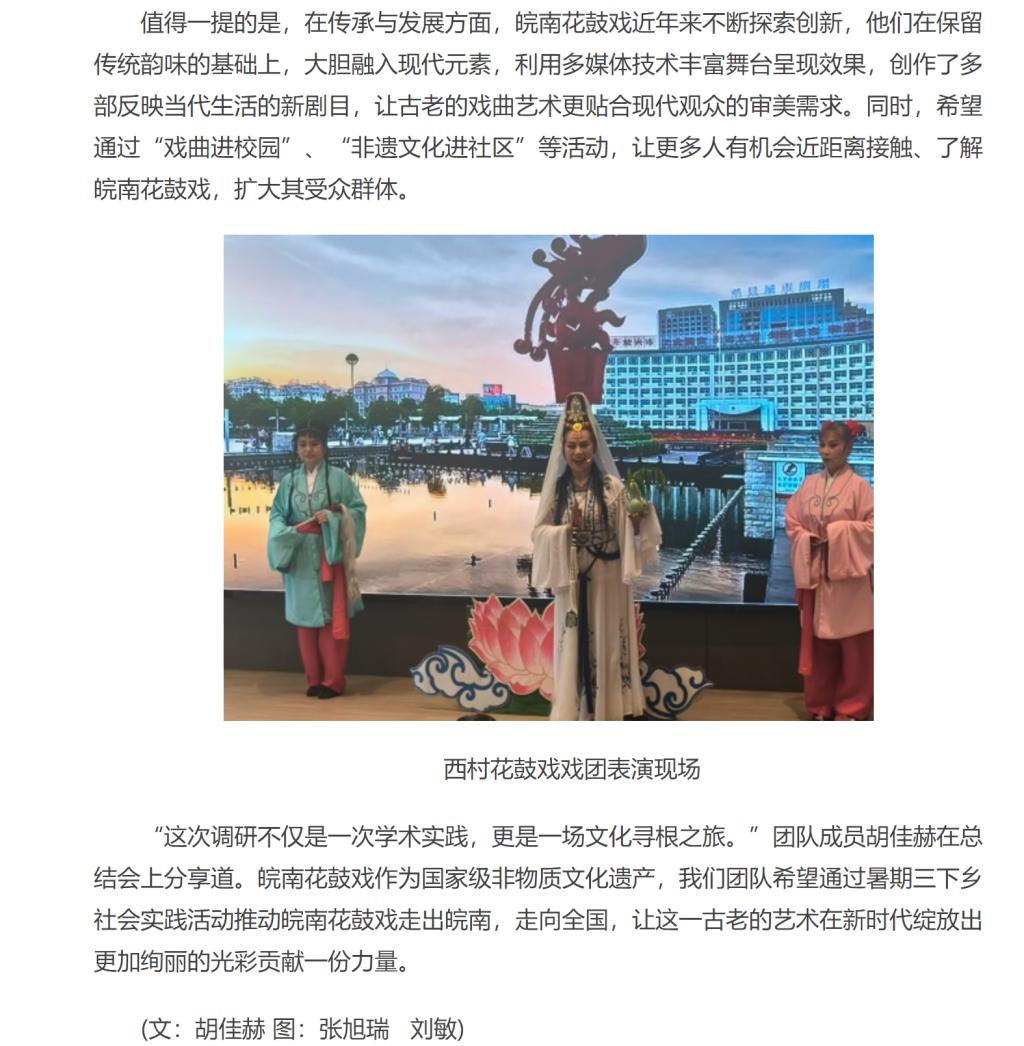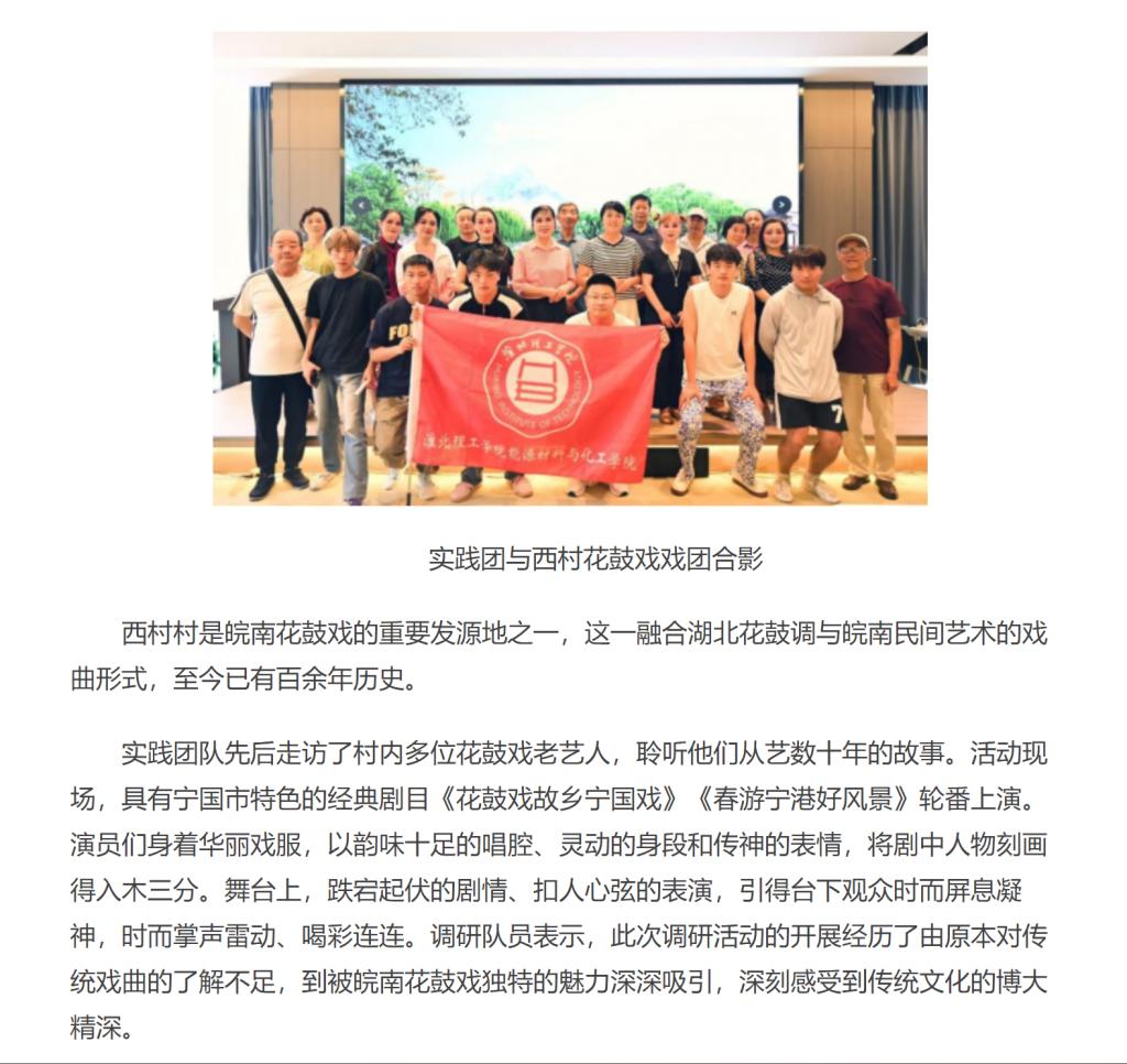 7月6日,Beat365唯一官方网站能源材料与化工学院的7名同学前往宣城市宁国市港口镇西村村,开展以“寻根花鼓戏·筑梦西村村——皖南花鼓戏非遗传承调研行动”为主题的专题调研,重点探寻该戏曲的历史渊源、传承现状及创新发展路径,期间现场欣赏了西村花鼓戏戏团的精彩表演。对此,中华网进行了报道: