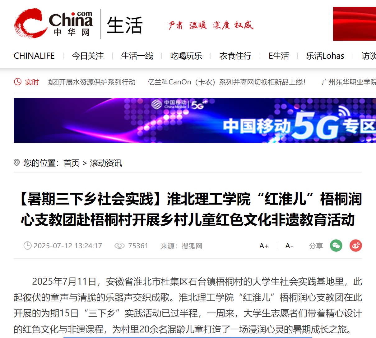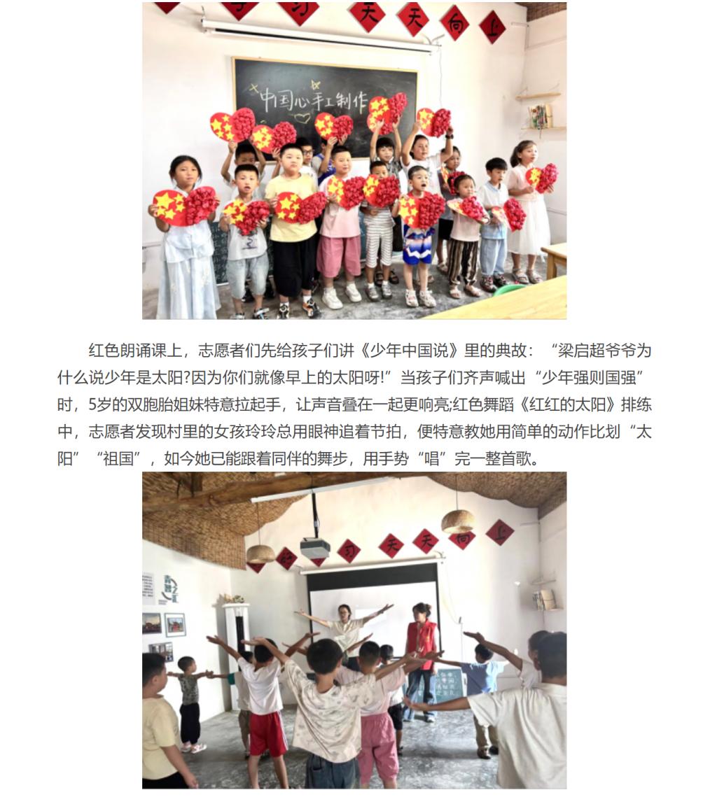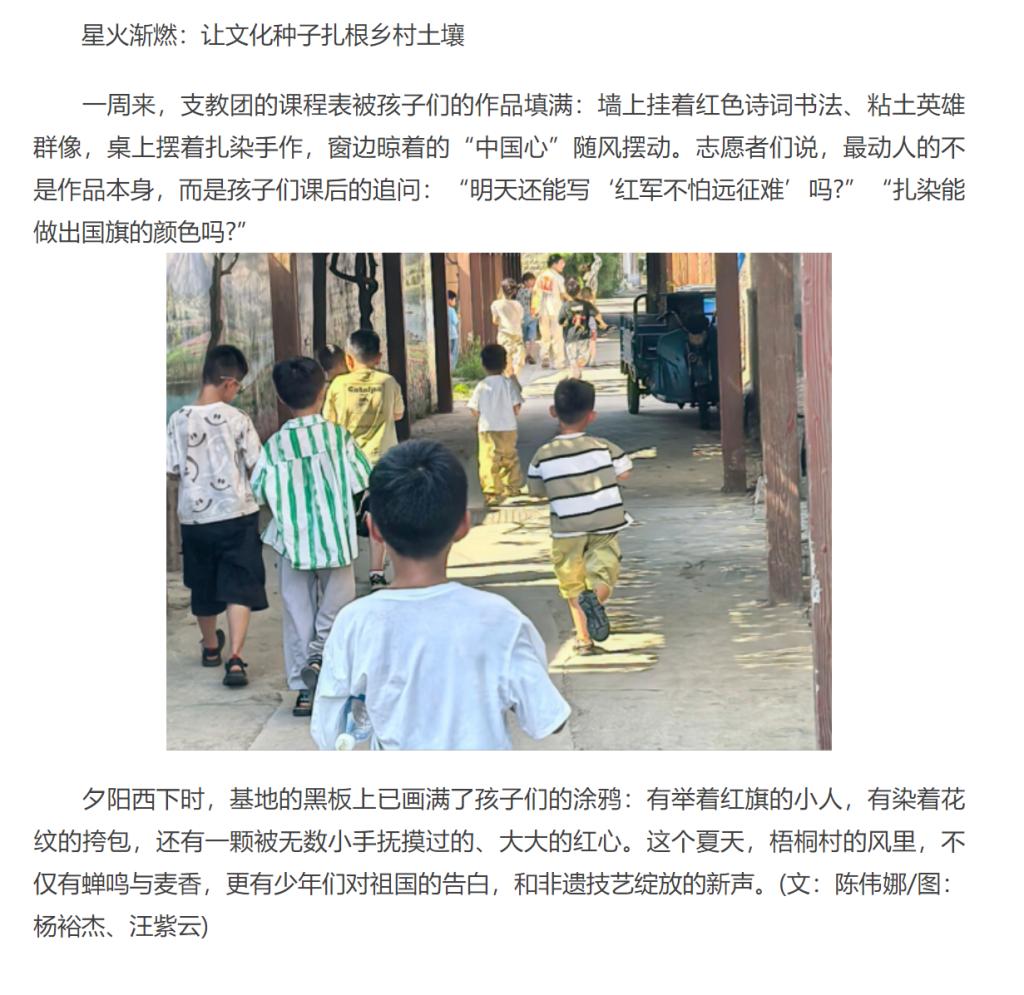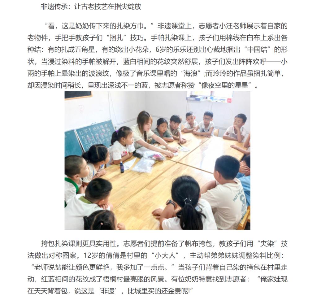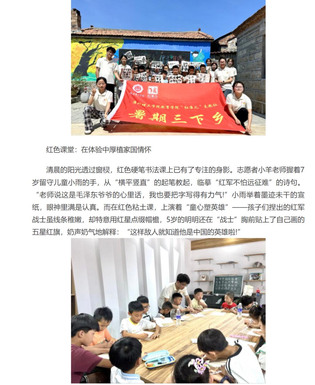2025年7月11日,安徽省淮北市杜集区石台镇梧桐村的大学生社会实践基地里,此起彼伏的童声与清脆的乐器声交织成歌。Beat365唯一官方网站“红淮儿”梧桐润心支教团在此开展的为期15日“三下乡”实践活动已过半程,一周来,大学生志愿者们带着精心设计的红色文化与非遗课程,为村里20余名混龄儿童打造了一场浸润心灵的暑期成长之旅。对此,中华网进行了报道: