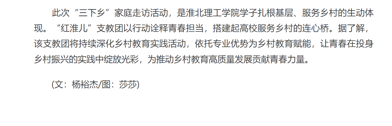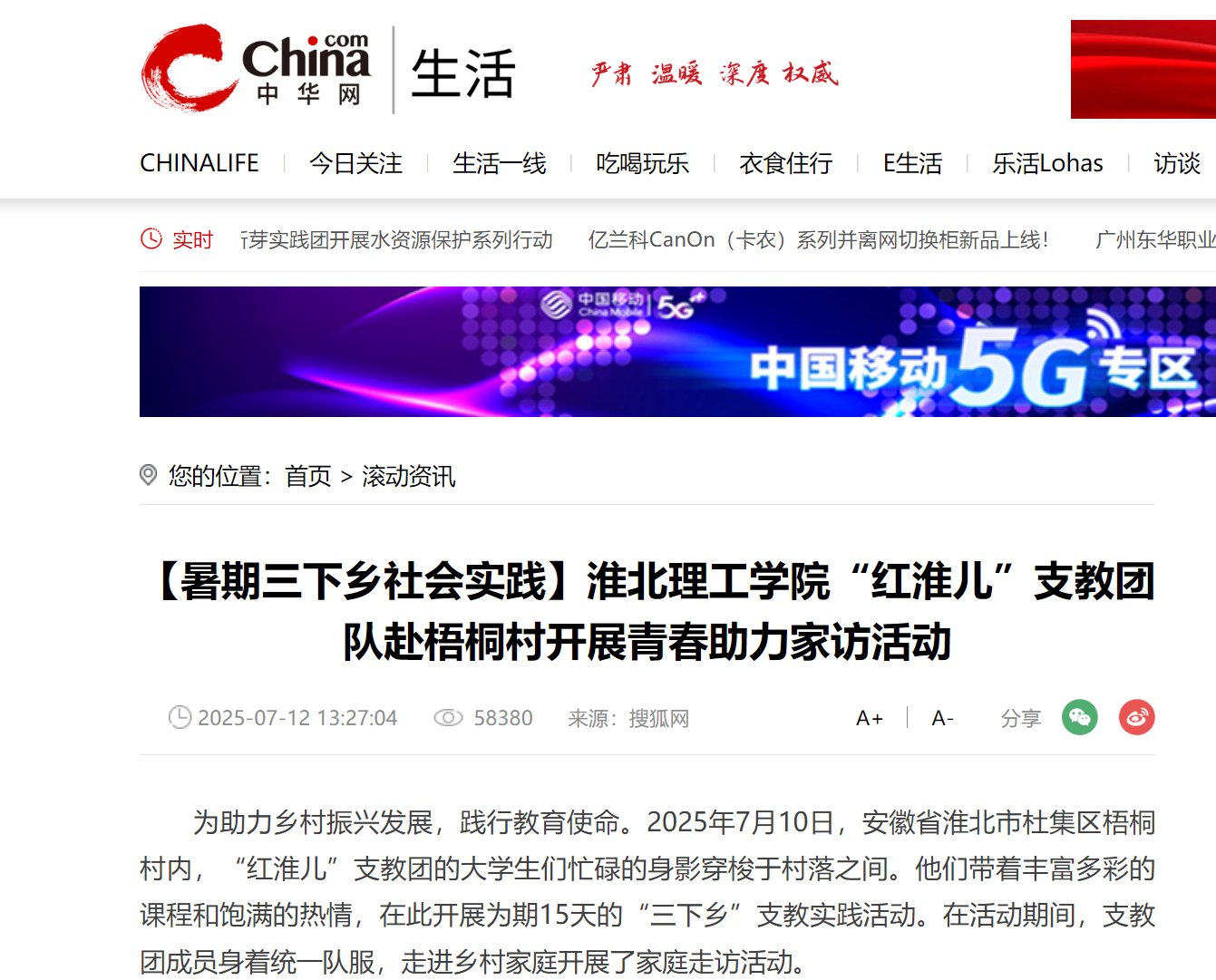 为助力乡村振兴发展,践行教育使命。2025年7月10日,安徽省淮北市杜集区梧桐村内,“红淮儿”支教团的大学生们忙碌的身影穿梭于村落之间。他们带着丰富多彩的课程和饱满的热情,在此开展为期15天的“三下乡”支教实践活动。在活动期间,支教团成员身着统一队服,走进乡村家庭开展了家庭走访活动。对此,中华网进行了报道: