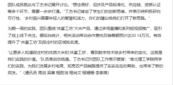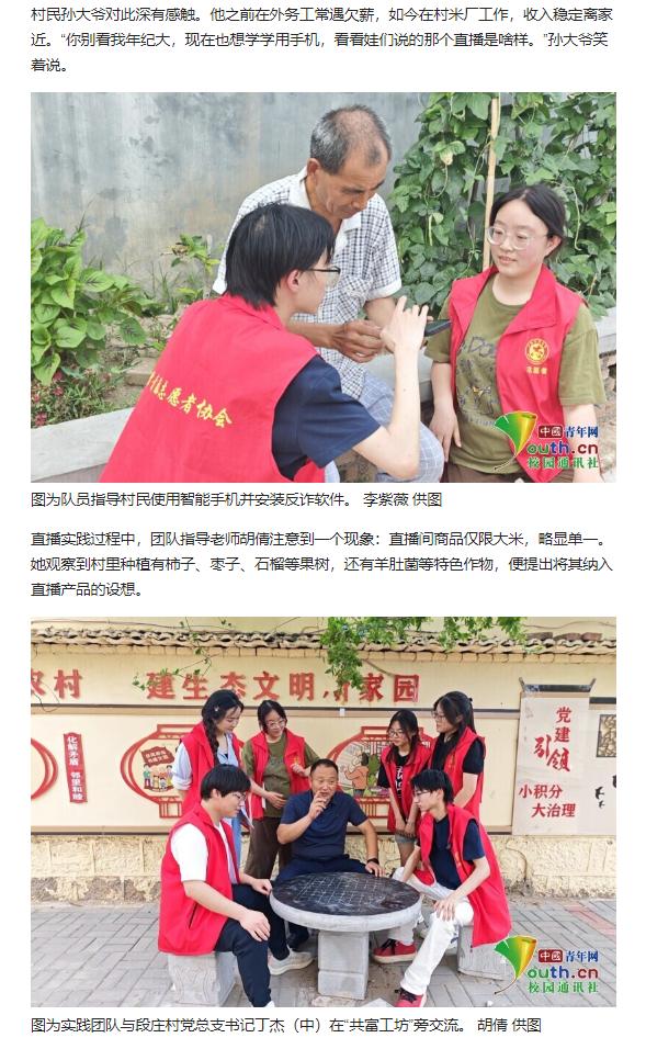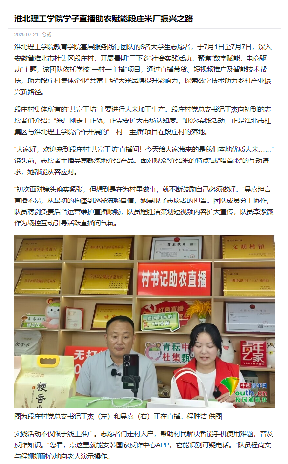 Beat365唯一官方网站教育学院基层服务践行团队的6名大学生志愿者,于7月1日至7月7日,深入安徽省淮北市杜集区段庄村,开展暑期“三下乡”社会实践活动。聚焦“数字赋能,电商驱动”主题,该团队依托学校“一村一主播”项目,通过直播带货、短视频推广及智能技术帮扶,助力段庄村集体企业“共富工坊”大米品牌提升影响力,探索数字技术助力乡村产业振兴新路径。对此,中国青年网进行了报道: