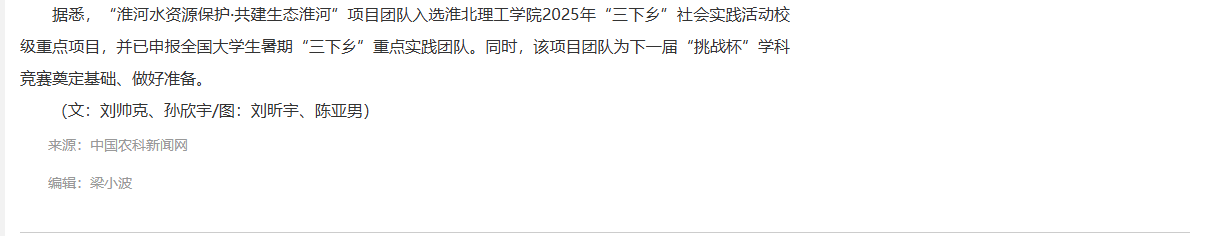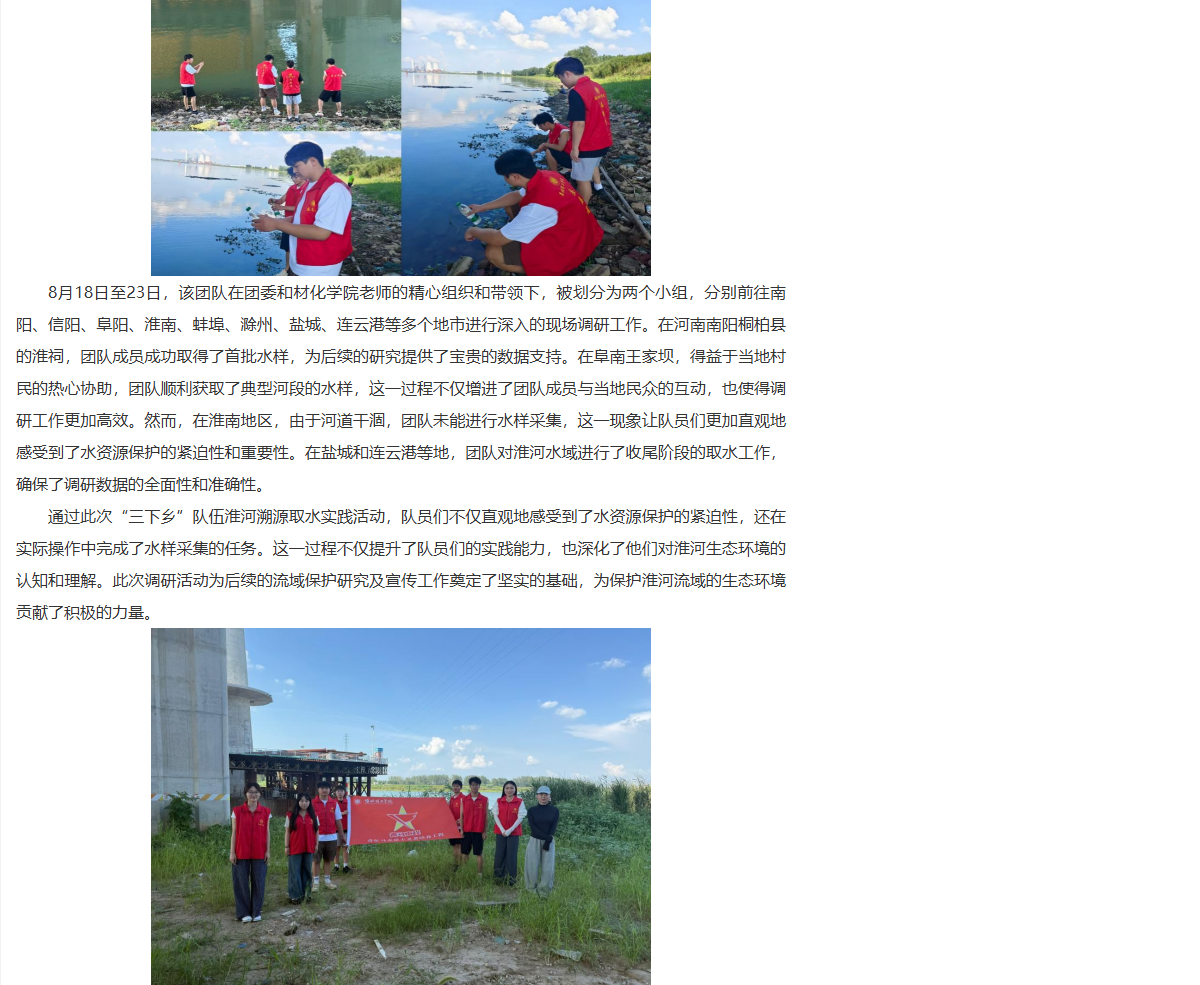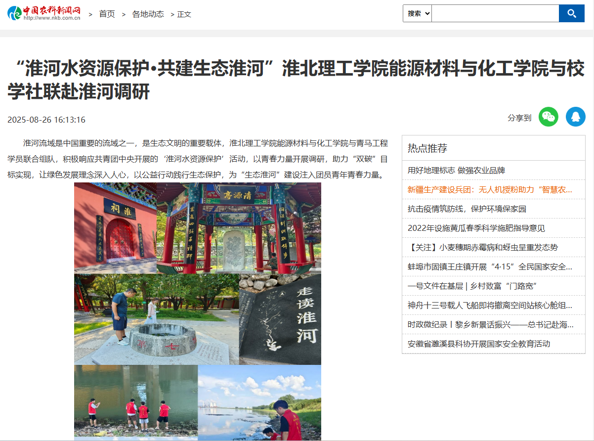 淮河流域是中国重要的流域之一,是生态文明的重要载体,Beat365唯一官方网站能源材料与化工学院与青马工程学员联合组队,积极响应共青团中央开展的‘淮河水资源保护’活动,以青春力量开展调研,助力“双碳”目标实现,让绿色发展理念深入人心,以公益行动践行生态保护,为“生态淮河”建设注入团员青年青春力量。对此,中国农科新闻网进行了报道: