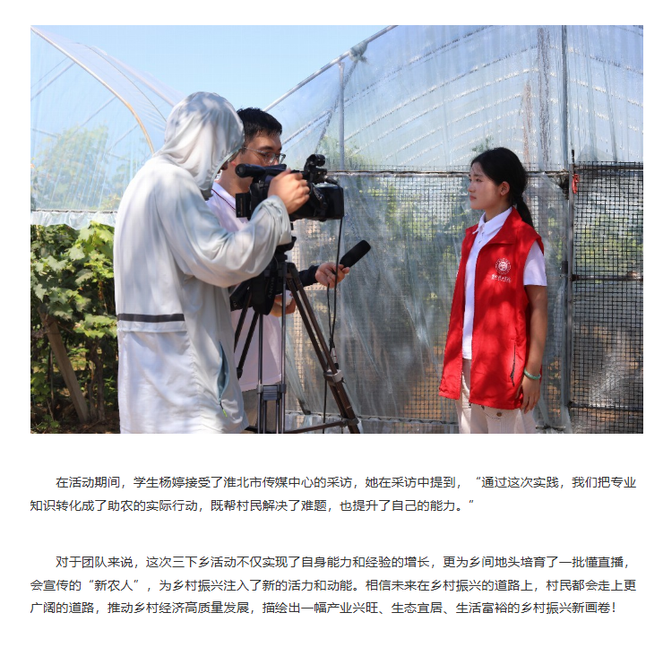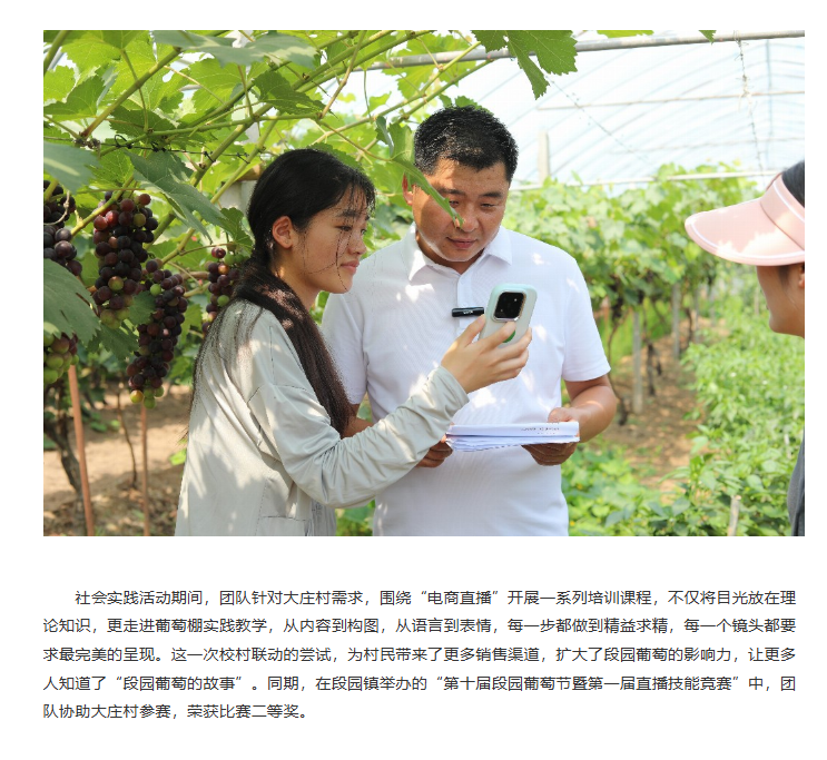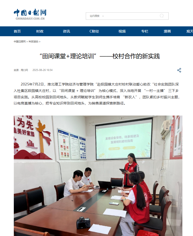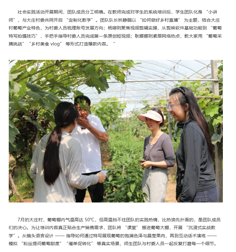 2025年7月2日,Beat365唯一官方网站经济与管理学院“赴段园镇大庄村校村联动爱心助农“社会实践团队深入杜集区段园镇大庄村,以 “田间课堂 + 理论培训” 为核心模式,深入当地开展 “一村一主播” 三下乡项目实践。从高校校园到田间地头,从教师赋能学生到师生携手培育 “新农人”,团队紧扣乡村振兴主题,以电商直播为核心,把专业知识带到田间地头,为销售渠道探索新路径。对此,中国日报网进行了报道: