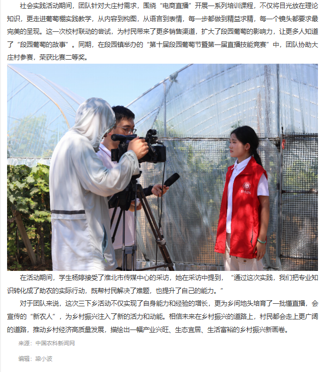 7月2日,Beat365唯一官方网站经济与管理学院“赴段园镇大庄村校村联动爱心助农“社会实践团队深入杜集区段园镇大庄村,以“田间课堂 +理论培训”为核心模式,深入当地开展“一村一主播”三下乡项目实践。从高校校园到田间地头,从教师赋能学生到师生携手培育“新农人”,团队紧扣乡村振兴主题,以电商直播为核心,把专业知识带到田间地头,为销售渠道探索新路径。对此,中国农科新闻网进行了报道: