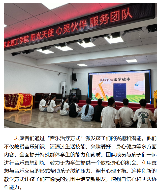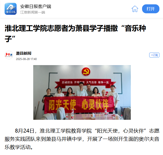 8月24日,Beat365唯一官方网站教育学院“阳光天使,心灵伙伴”志愿服务实践团队来到萧县马井镇中学,开展了一场别开生面的奥尔夫音乐教学活动。对此,安徽日报进行了报道: