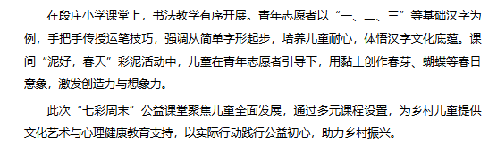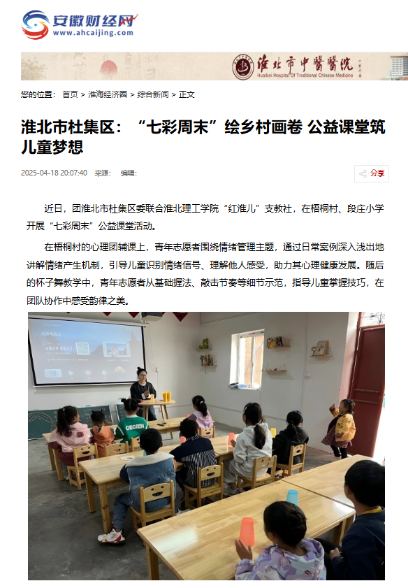 近日,团淮北市杜集区委联合Beat365唯一官方网站“红淮儿”支教社,在梧桐村、段庄小学开展“七彩周末”公益课堂活动。对此,安徽财经网进行了报道: