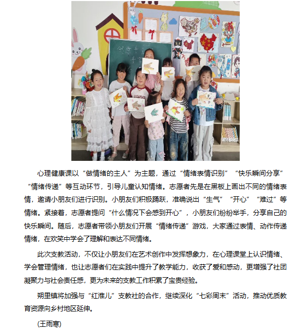 “红淮儿”支教社30余名志愿者走进淮北市杜集区朔里镇段庄村,开展“七彩周末”支教活动,通过创意手工与心理健康两大主题课程,为当地60余名儿童带来别开生面的周末体验。对此,安徽财经网进行了报道:
