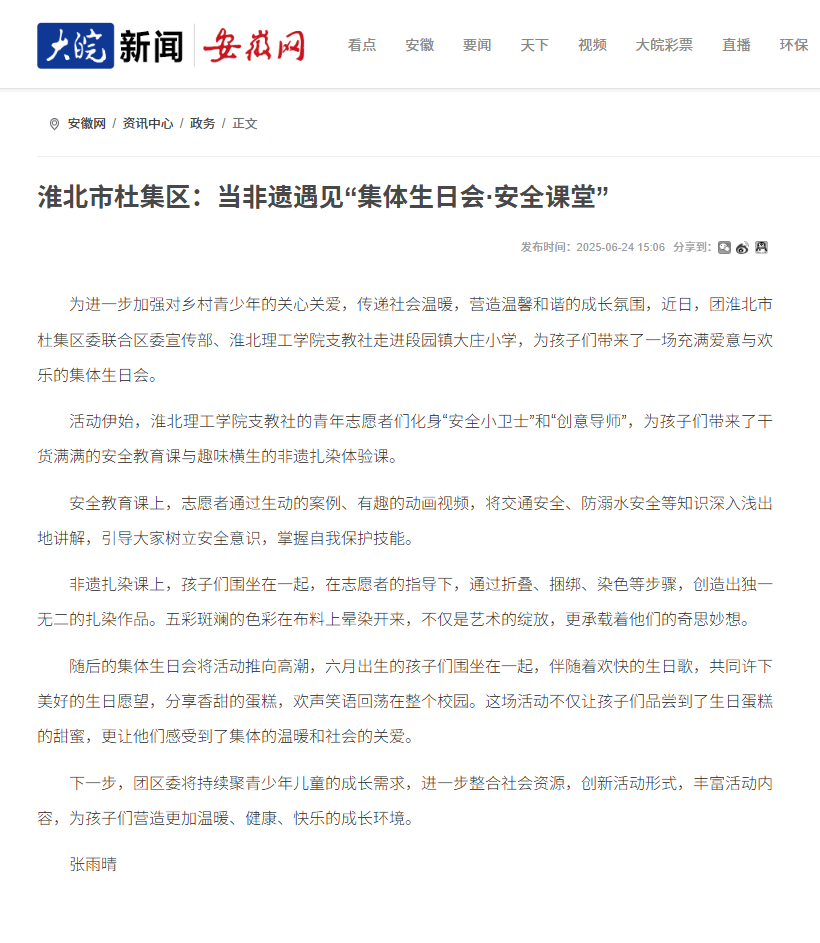 为进一步加强对乡村青少年的关心关爱,传递社会温暖,营造温馨和谐的成长氛围,近日,团淮北市杜集区委联合区委宣传部、Beat365唯一官方网站支教社走进段园镇大庄小学,为孩子们带来了一场充满爱意与欢乐的集体生日会。对此,安徽网进行了报道: