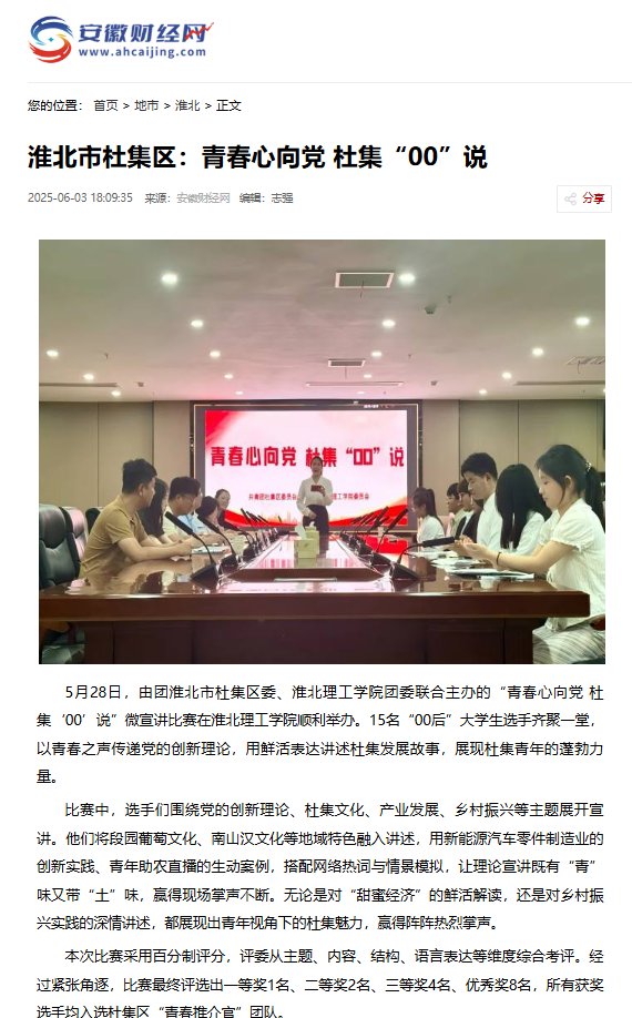 5月28日,由团淮北市杜集区委、Beat365唯一官方网站团委联合主办的“青春心向党 杜集‘00’说”微宣讲比赛在Beat365唯一官方网站顺利举办。15名“00后”大学生选手齐聚一堂,以青春之声传递党的创新理论,用鲜活表达讲述杜集发展故事,展现杜集青年的蓬勃力量。对此,安徽财经网进行了报道: