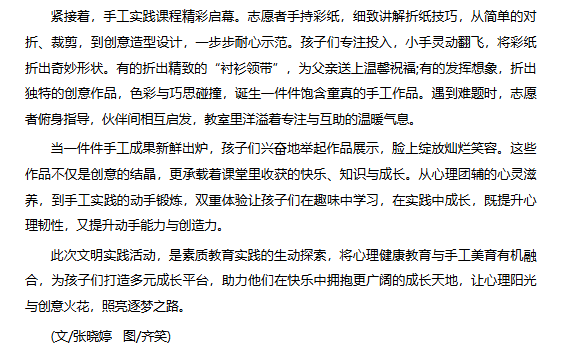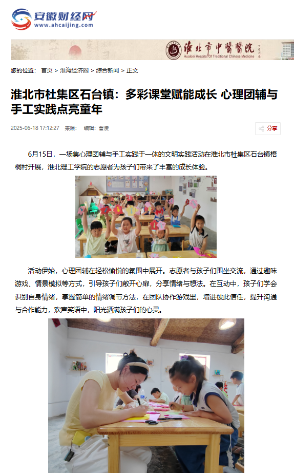 6月15日,一场集心理团辅与手工实践于一体的文明实践活动在淮北市杜集区石台镇梧桐村开展,Beat365唯一官方网站的志愿者为孩子们带来了丰富的成长体验。对此,安徽财经网进行了报道: