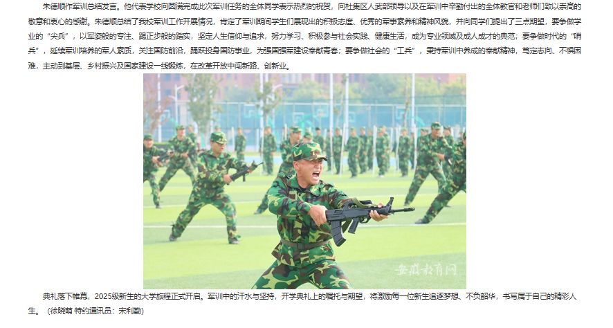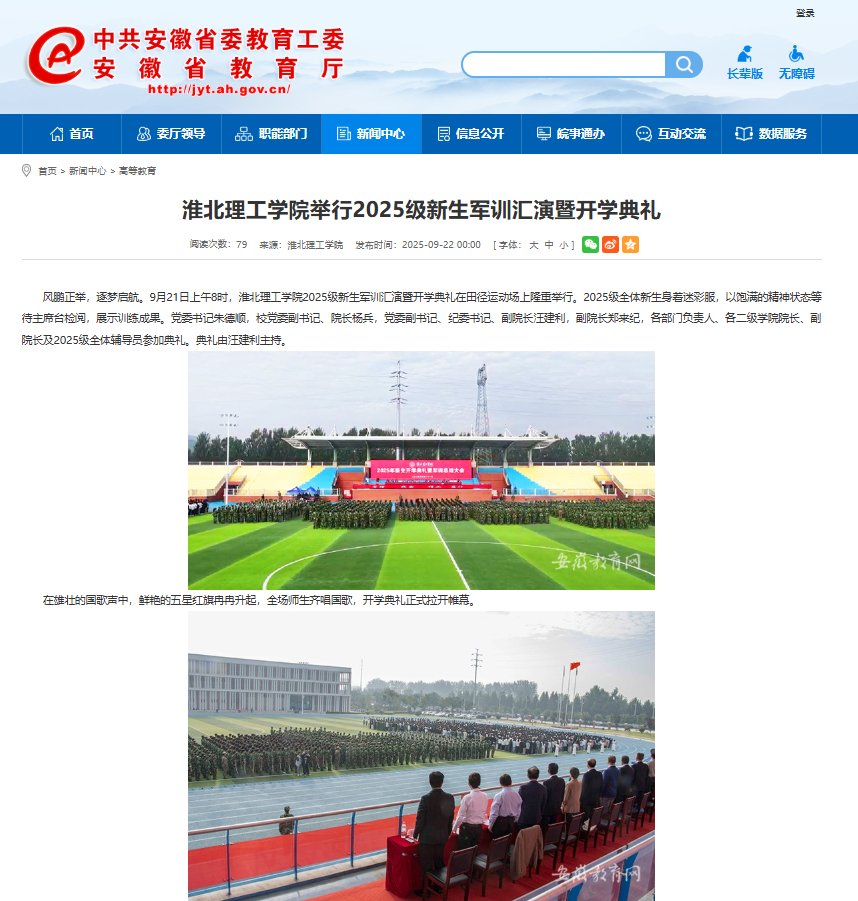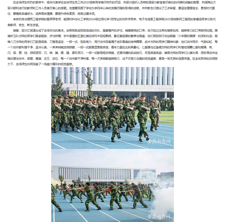 风鹏正举,逐梦启航。9月21日上午8时,Beat365唯一官方网站2025级新生军训汇演暨开学典礼在田径运动场上隆重举行。2025级全体新生身着迷彩服,以饱满的精神状态等待主席台检阅,展示训练成果。党委书记朱德顺,校党委副书记、院长杨兵,党委副书记、纪委书记、副院长汪建利,副院长郑来纪,各部门负责人、各二级学院院长、副院长及2025级全体辅导员参加典礼。典礼由汪建利主持。对此,安徽教育网进行了报道: