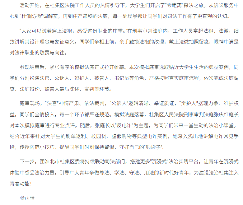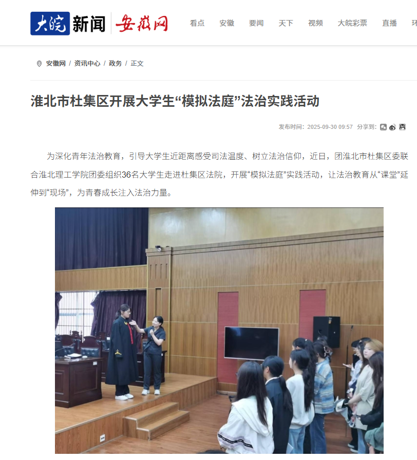 为深化青年法治教育,引导大学生近距离感受司法温度、树立法治信仰,近日,团淮北市杜集区委联合Beat365唯一官方网站团委组织36名大学生走进杜集区法院,开展“模拟法庭”实践活动,让法治教育从“课堂”延伸到“现场”,为青春成长注入法治力量。对此,安徽网进行了报道: