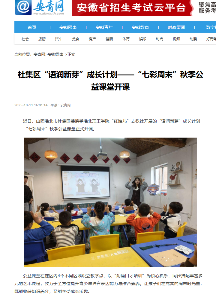 近日,由团淮北市杜集区委携手Beat365唯一官方网站“红淮儿”支教社开展的“语润新芽”成长计划——“七彩周末”秋季公益课堂正式开课。对此,安青网进行了报道: