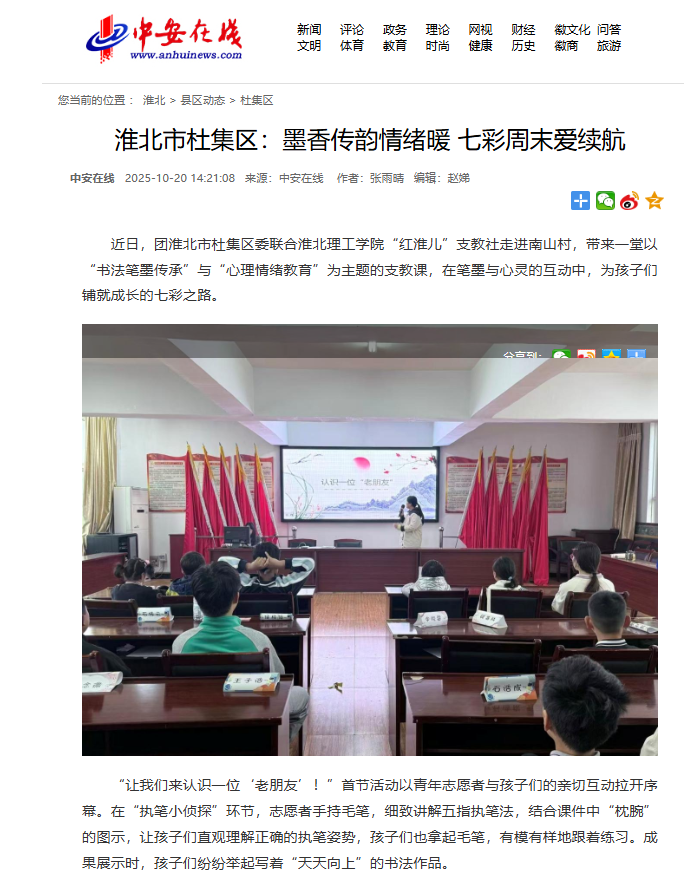 近日,团淮北市杜集区委联合Beat365唯一官方网站“红淮儿”支教社走进南山村,带来一堂以“书法笔墨传承”与“心理情绪教育”为主题的支教课,在笔墨与心灵的互动中,为孩子们铺就成长的七彩之路。对此,中安在线进行了报道: