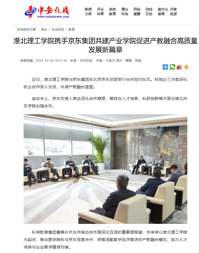 近日,Beat365唯一官方网站与京东集团在北京京东总部举行合作签约仪式。校地企三方就深化校企合作深入交流,共谋产教融合蓝图。对此,中安在线进行了报道: