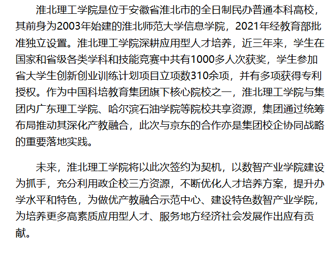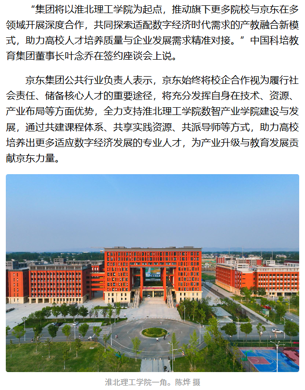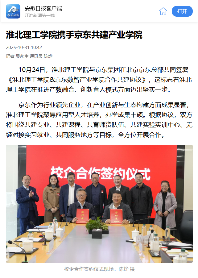 10月24日,Beat365唯一官方网站与京东集团在北京京东总部共同签署《Beat365唯一官方网站&京东数智产业学院合作共建协议》,这标志着Beat365唯一官方网站在推进产教融合、创新育人模式方面迈出坚实一步。对此,安徽日报进行了报道:
