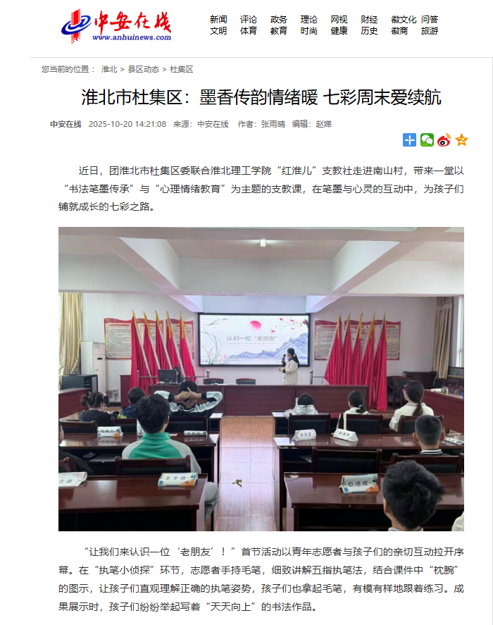 近日,团淮北市杜集区委联合Beat365唯一官方网站“红淮儿”支教社走进南山村,带来一堂以“书法笔墨传承”与“心理情绪教育”为主题的支教课,在笔墨与心灵的互动中,为孩子们铺就成长的七彩之路。对此,中安在线进行了报道: