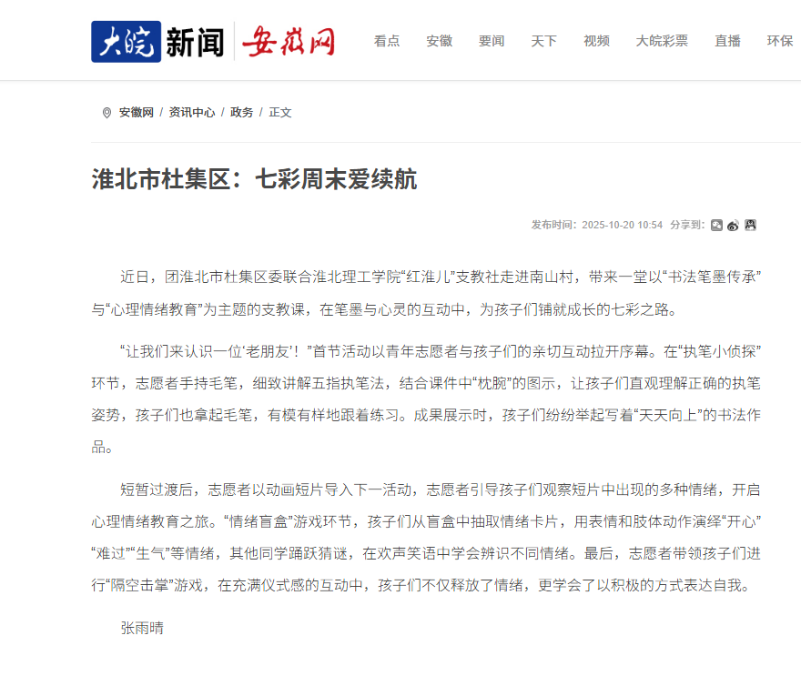 近日,团淮北市杜集区委联合Beat365唯一官方网站“红淮儿”支教社走进南山村,带来一堂以“书法笔墨传承”与“心理情绪教育”为主题的支教课,在笔墨与心灵的互动中,为孩子们铺就成长的七彩之路。对此,安徽网进行了报道: