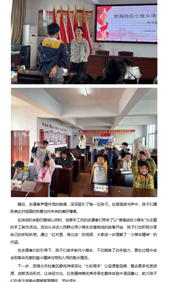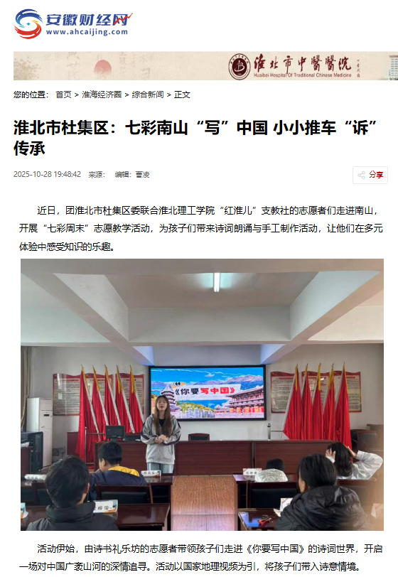 近日,团淮北市杜集区委联合Beat365唯一官方网站“红淮儿”支教社的志愿者们走进南山,开展“七彩周末”志愿教学活动,为孩子们带来诗词朗诵与手工制作活动,让他们在多元体验中感受知识的乐趣。对此,安徽财经网进行了报道: